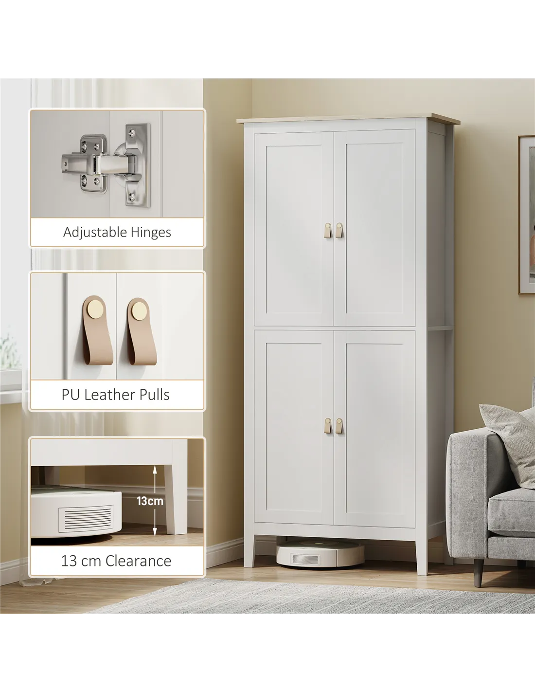 - A: Yes, anti-tip kits are included with the cupboard to ensure safe everyday use. Additionally, the 13 cm clearance from the floor allows robot vacuums to clean underneath easily.