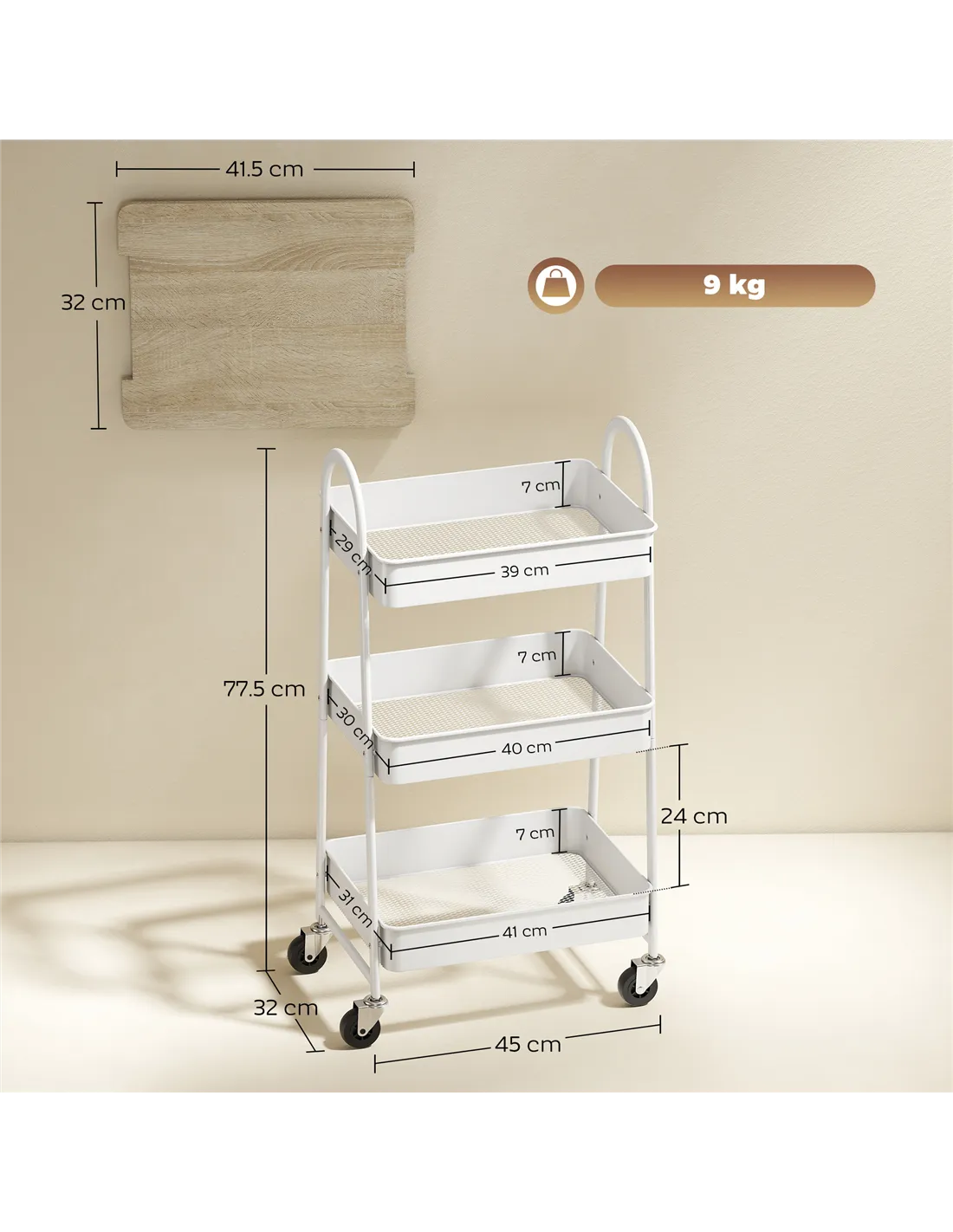 - A: The HOMCOM 3-Tier Kitchen Storage Trolley supports an overall weight of 9 kg. Each individual tier has a weight capacity of 3 kg.