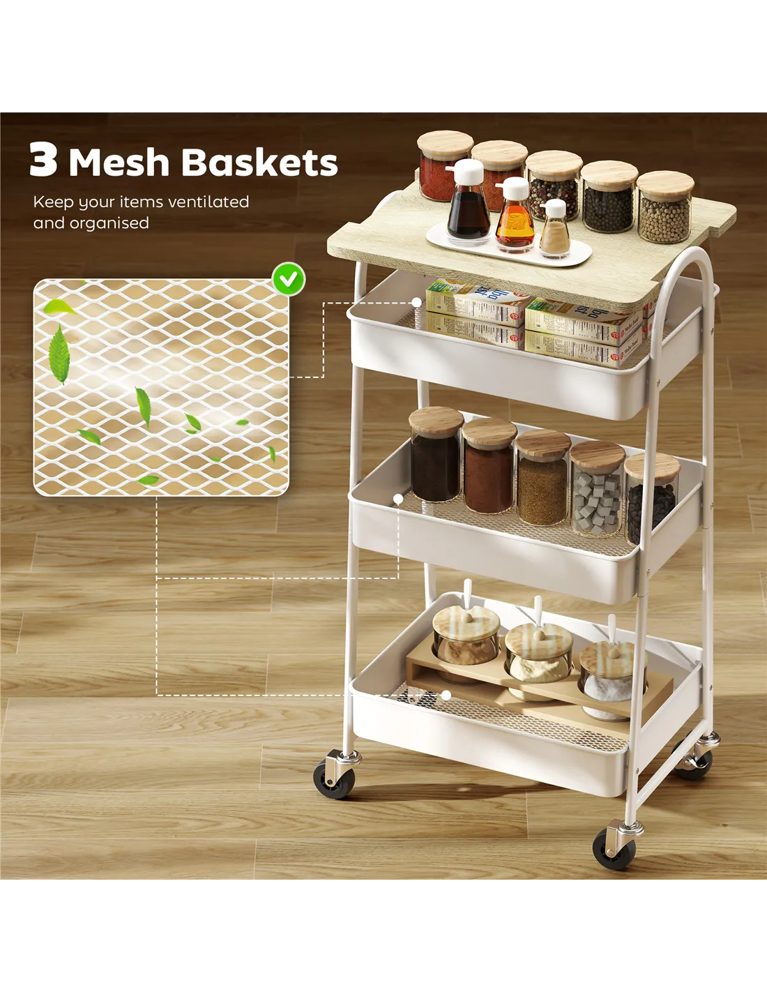 HOMCOM 3-Tier Kitchen Storage Trolley with on Wheels Cover Top Board - White and Oak