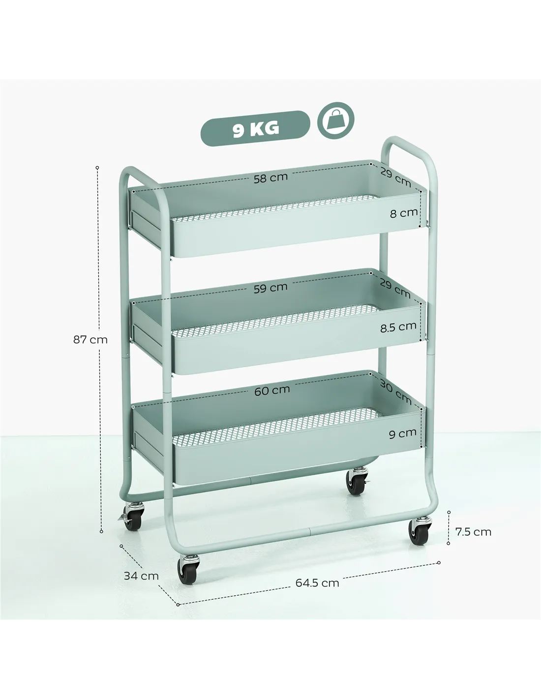 - A: The HOMCOM 3-Tier Storage Trolley has a maximum total load capacity of 9 kg. Each individual basket supports a maximum of 3 kg.