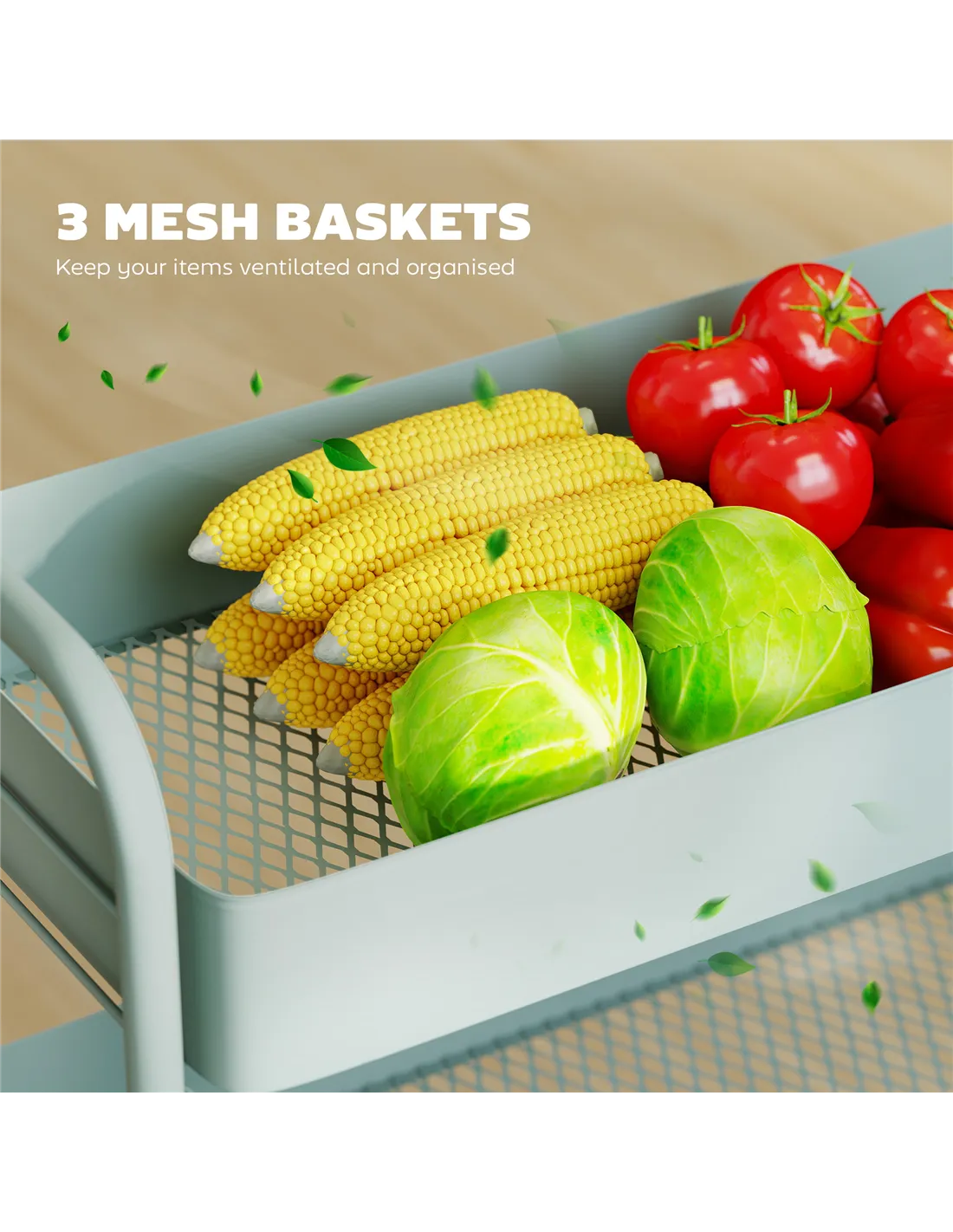 HOMCOM 3-Tier Storage Trolley on Wheels, Rolling Utility Cart with Mesh Backets for Kitchen, Bathroom, Bedroom, Light Green