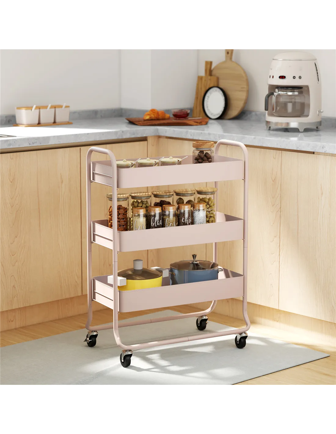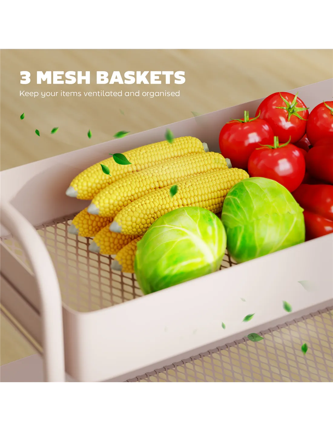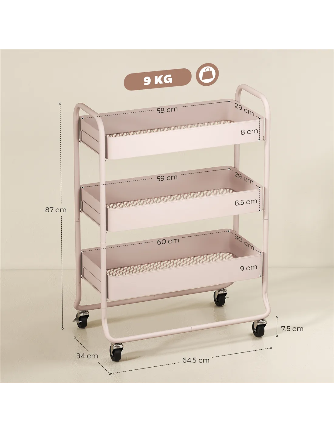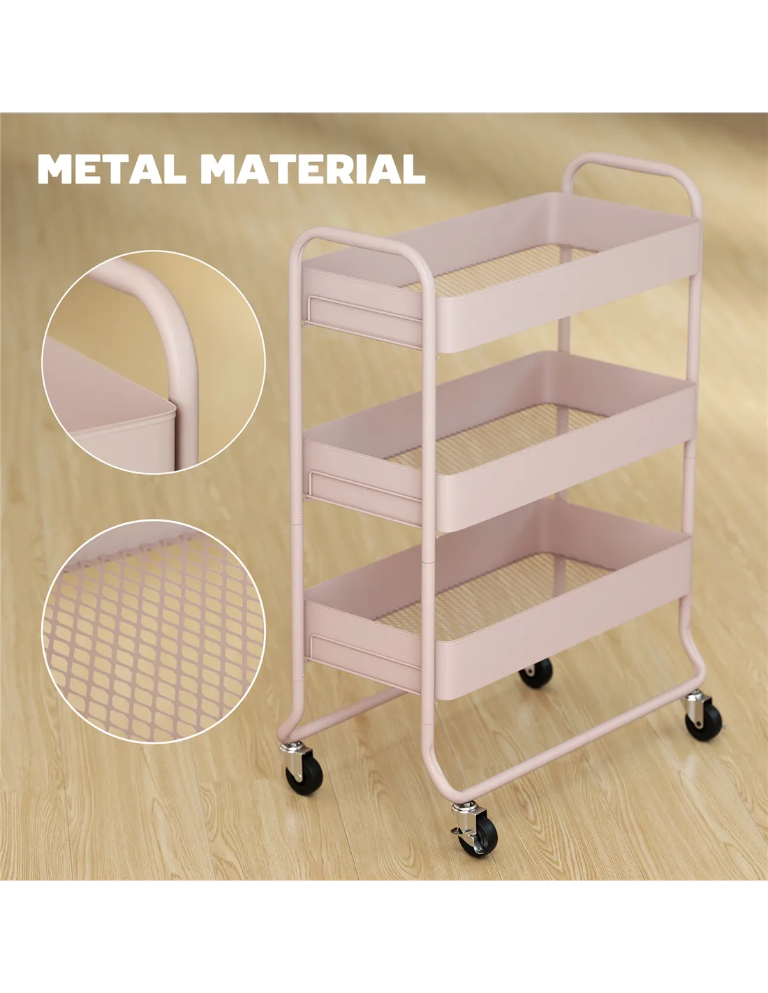 HOMCOM 3-Tier Storage Trolley on Wheels, Rolling Utility Cart with Mesh Backets for Kitchen, Bathroom, Bedroom, Light Pink