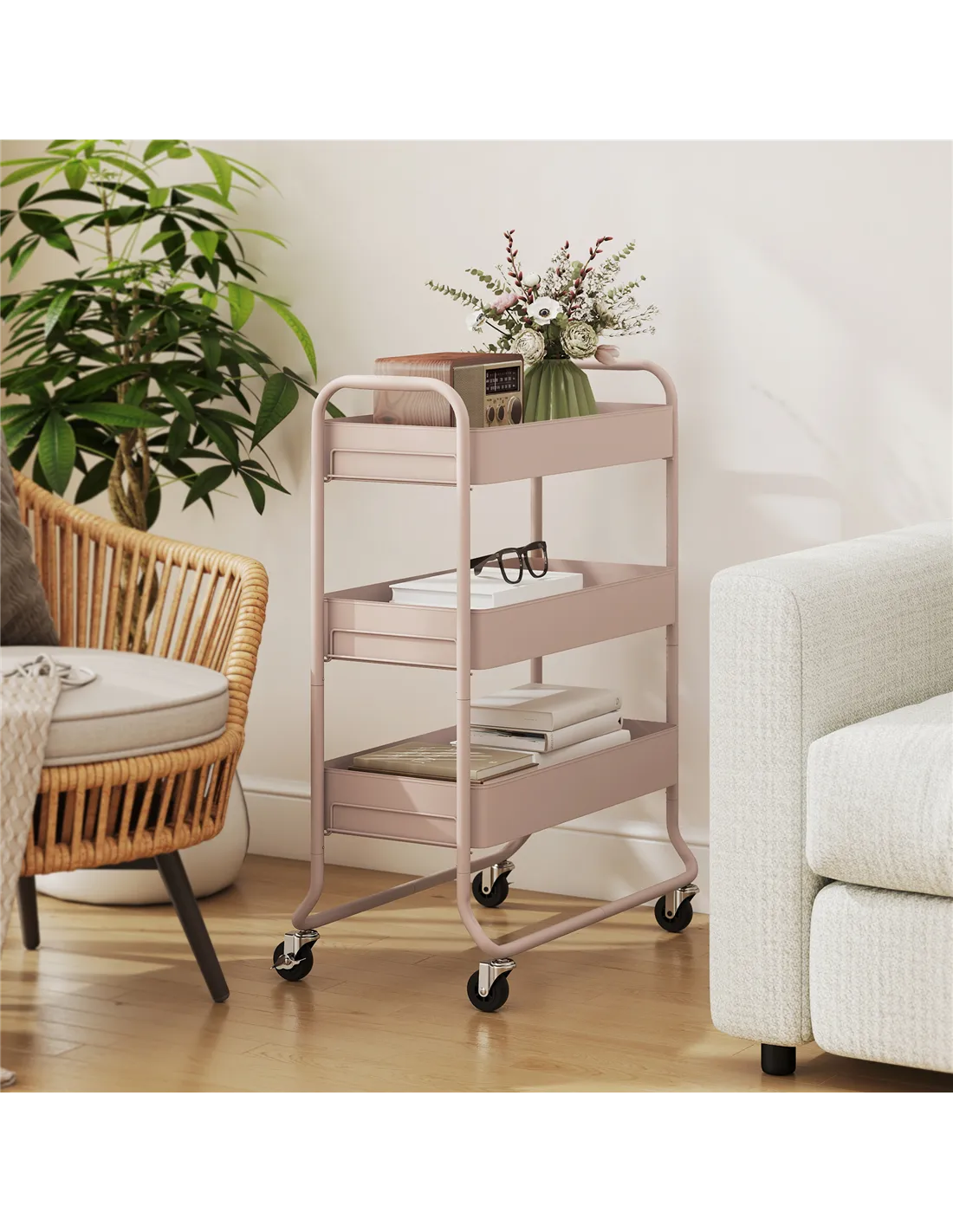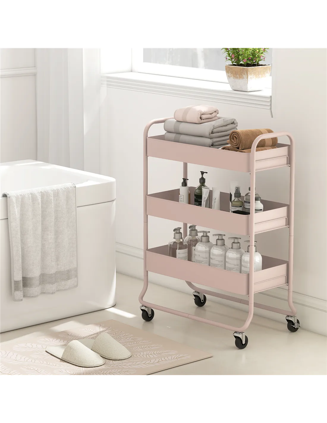 - A: This rolling utility cart comes in a light pink colour and is constructed from durable metal.