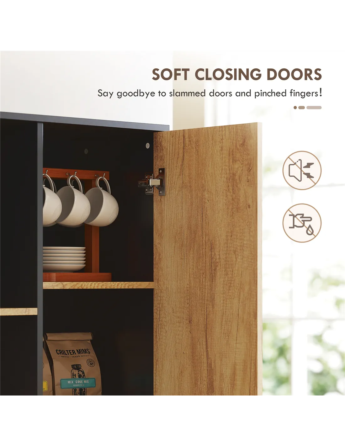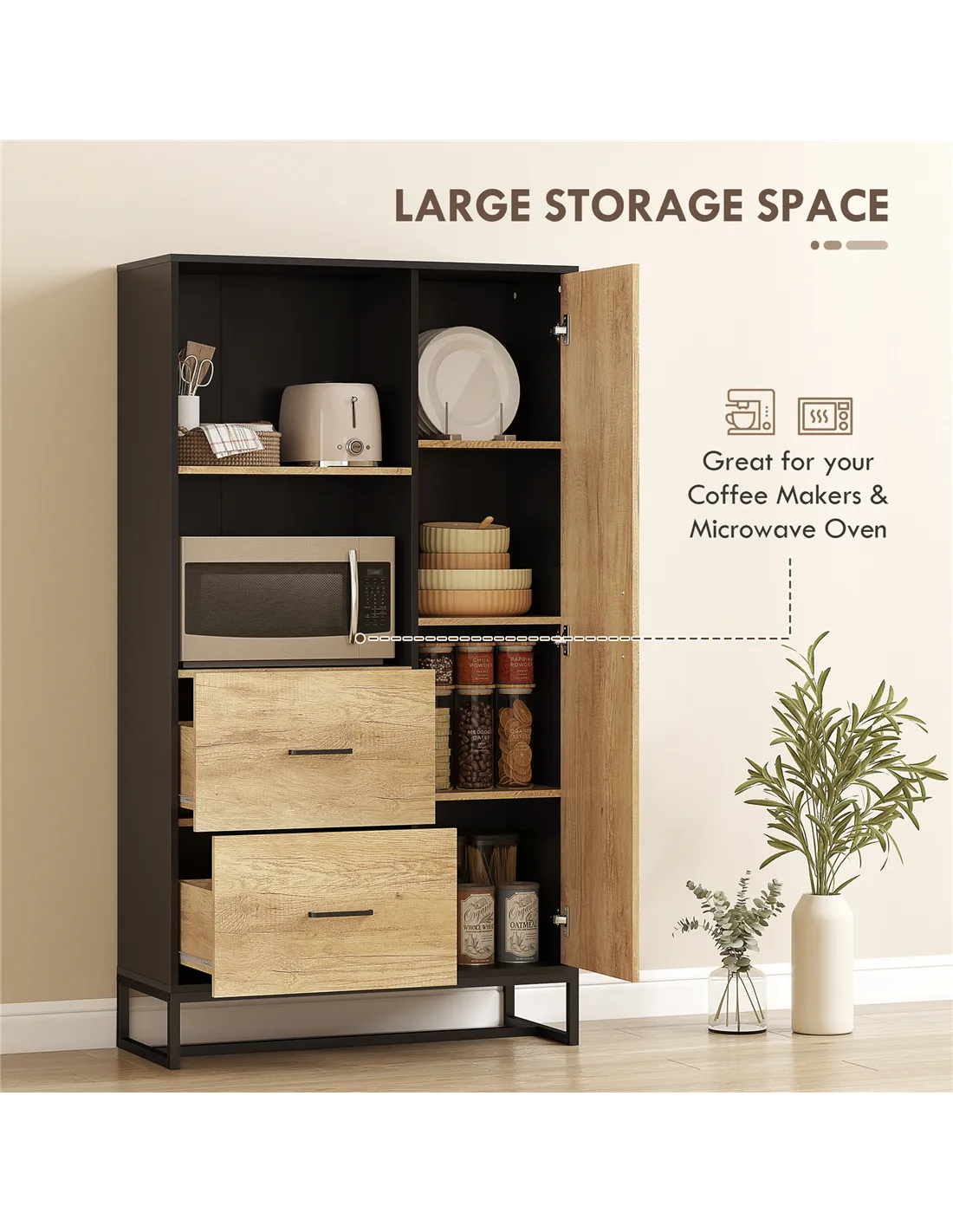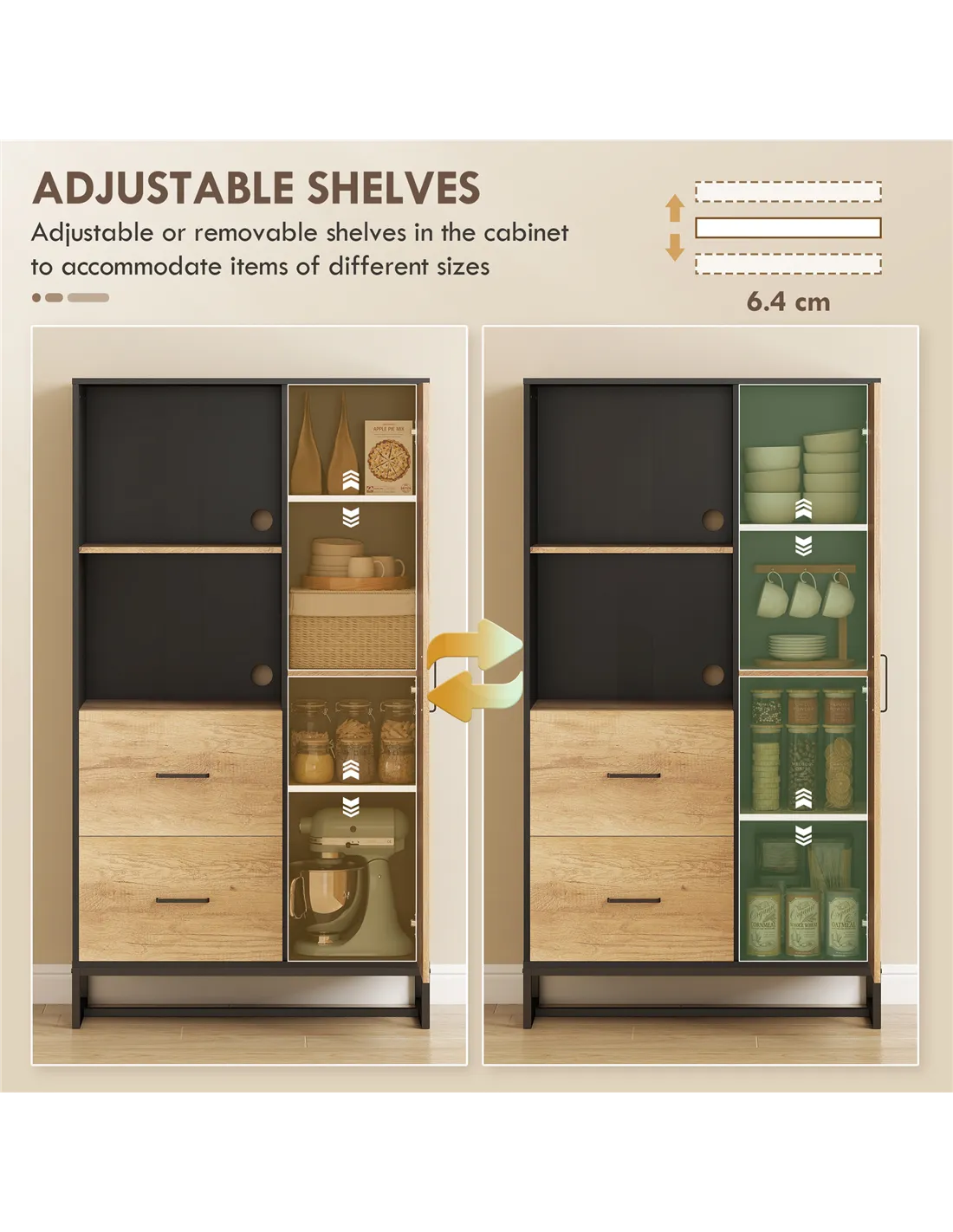 Maximise your kitchen storage with the HOMCOM Tall Kitchen Cupboard, a freestanding pantry cabinet designed for British homes. This 160cm unit offers versatile organisation, combining robust particle board construction with a stylish black frame and natural wood-effect doors. Achieve an industrial look while benefiting from practical features. It includes two open shelves, two smooth-gliding drawers, and a cupboard with adjustable shelving. Store various kitchen and dining items efficiently. The soft-close door ensures quiet operation. Anti-tipping straps provide added safety. An elevated metal base simplifies cleaning. This HOMCOM cabinet helps you declutter your space and enhances your kitchen's aesthetic. It provides a durable and functional storage solution.