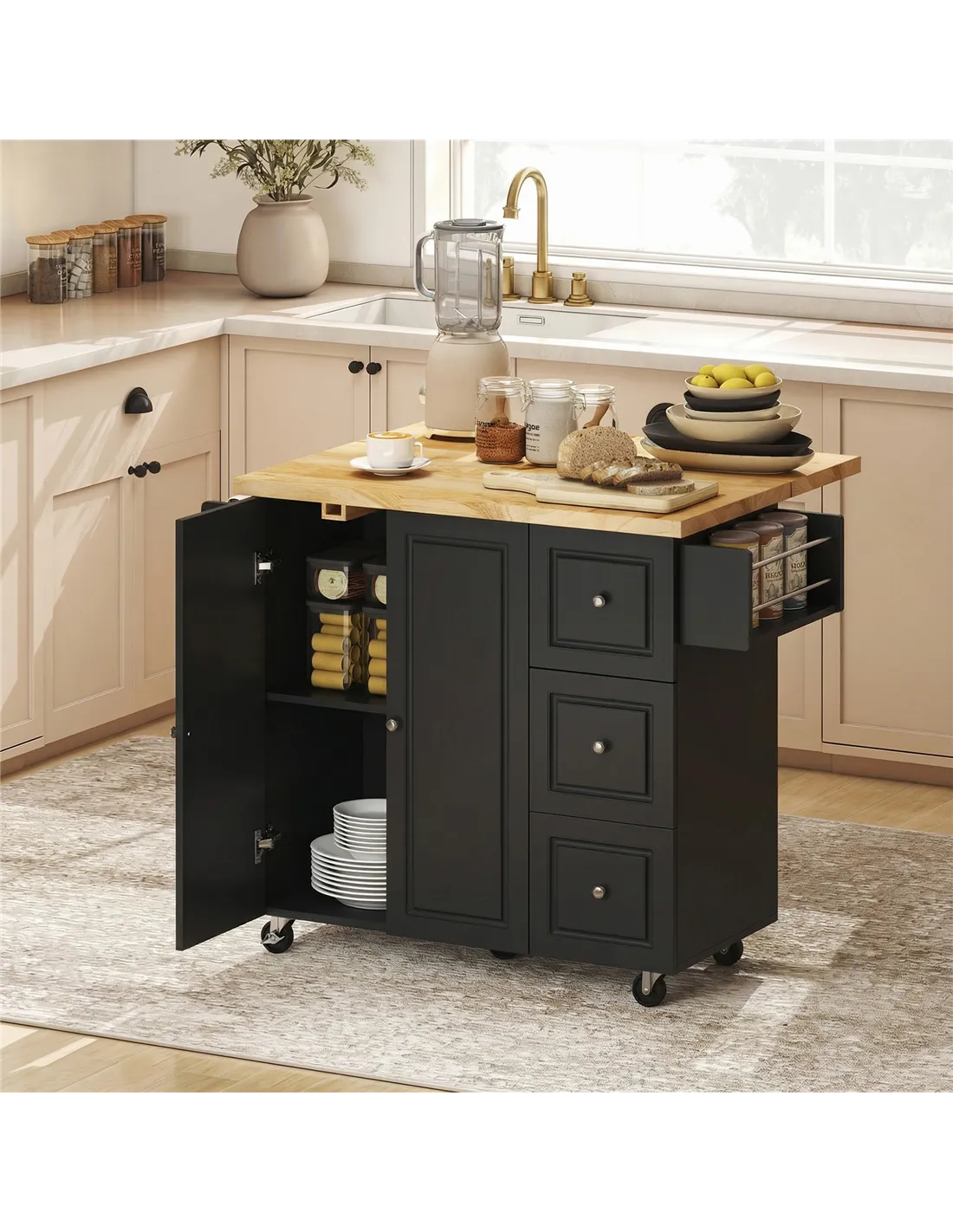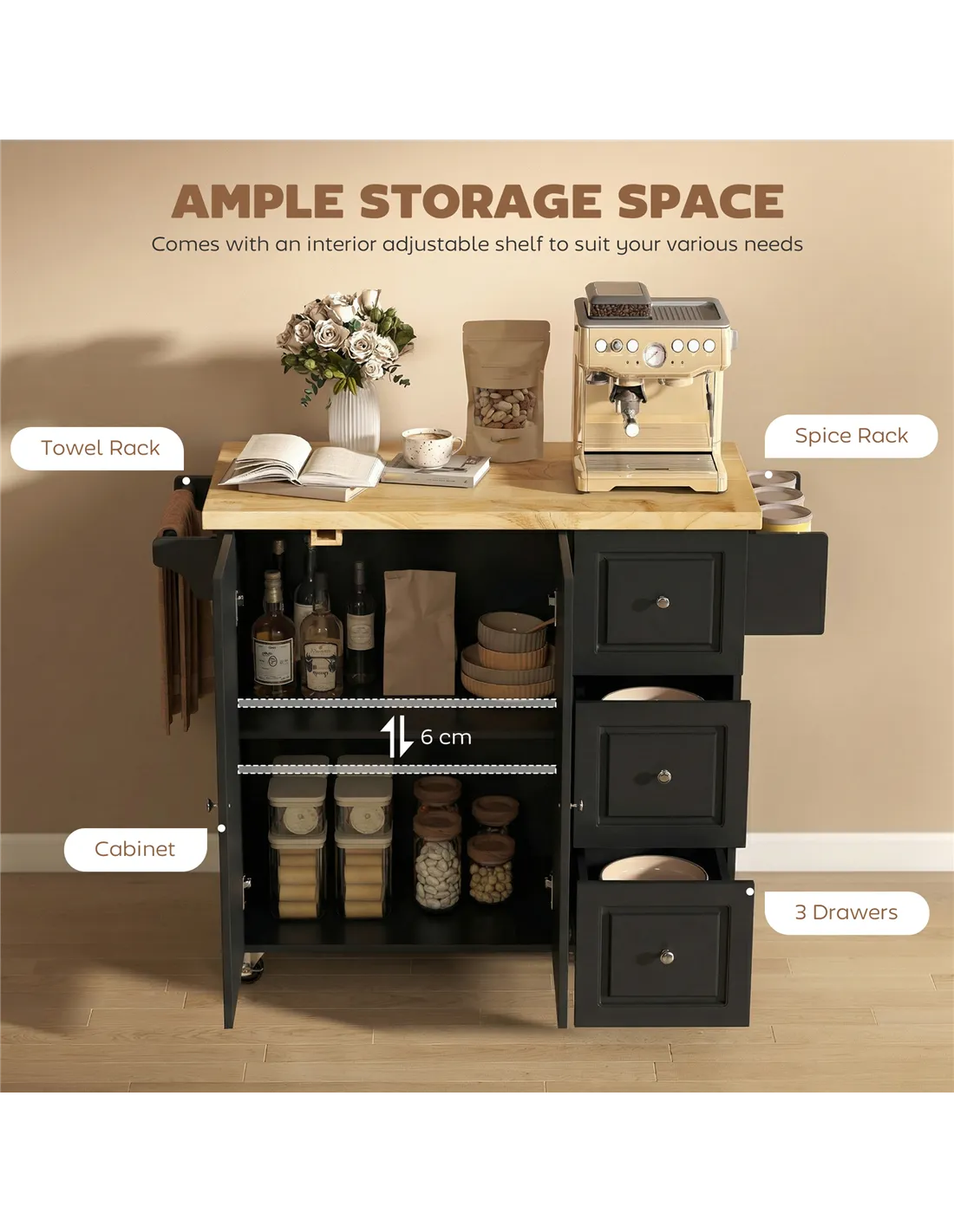 Enhance your kitchen's functionality and organisation with the HOMCOM Kitchen Island on Wheels. This rolling kitchen storage trolley, presented in a sleek black finish, delivers essential versatility for any UK home. It features a practical drop-leaf extension, transforming your workspace into an instant dining or counter table. Efficiently manage your kitchen essentials with a spacious two-door cabinet and three drawers. This island keeps kitchenware, dinnerware, and utensils neatly stored and accessible. A dedicated towel rack and a convenient spice stand ensure easy access to frequently used items. Five smooth-gliding caster wheels allow effortless repositioning of the unit, with two wheels featuring brakes for secure stationary placement. An adjustable shelf inside the cabinet customises your storage. Maximise your kitchen efficiency and maintain a clutter-free environment.