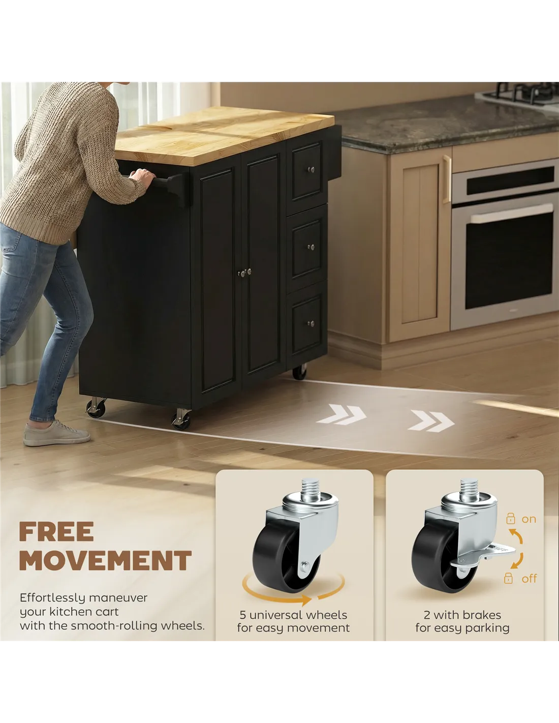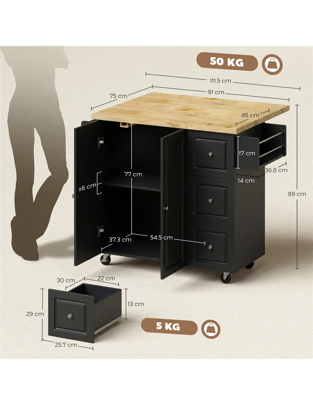 HOMCOM Kitchen Island on Wheels, Rolling Kitchen Storage Trolley with Drop Leaf, Drawers, Towel and Spice Rack, Black