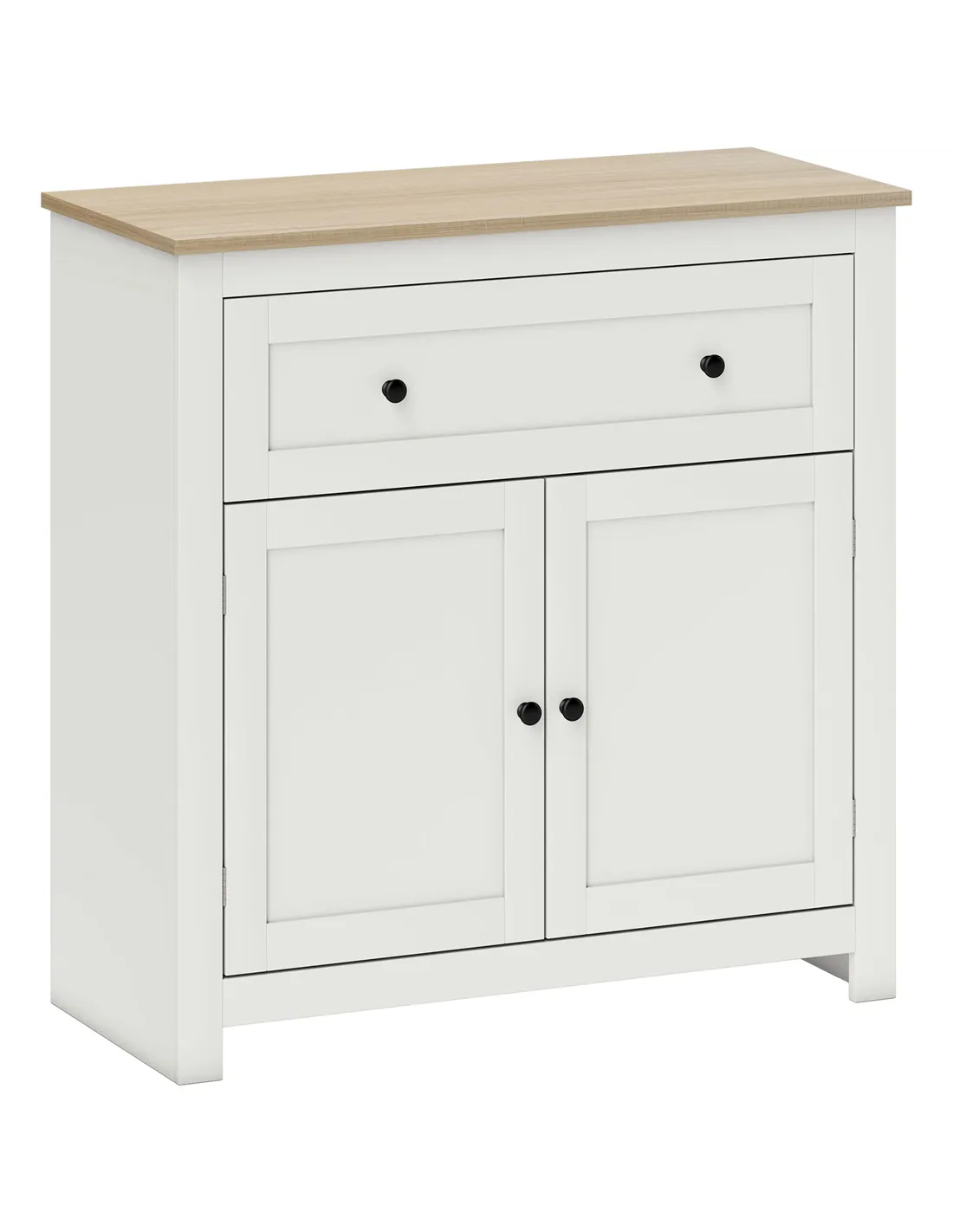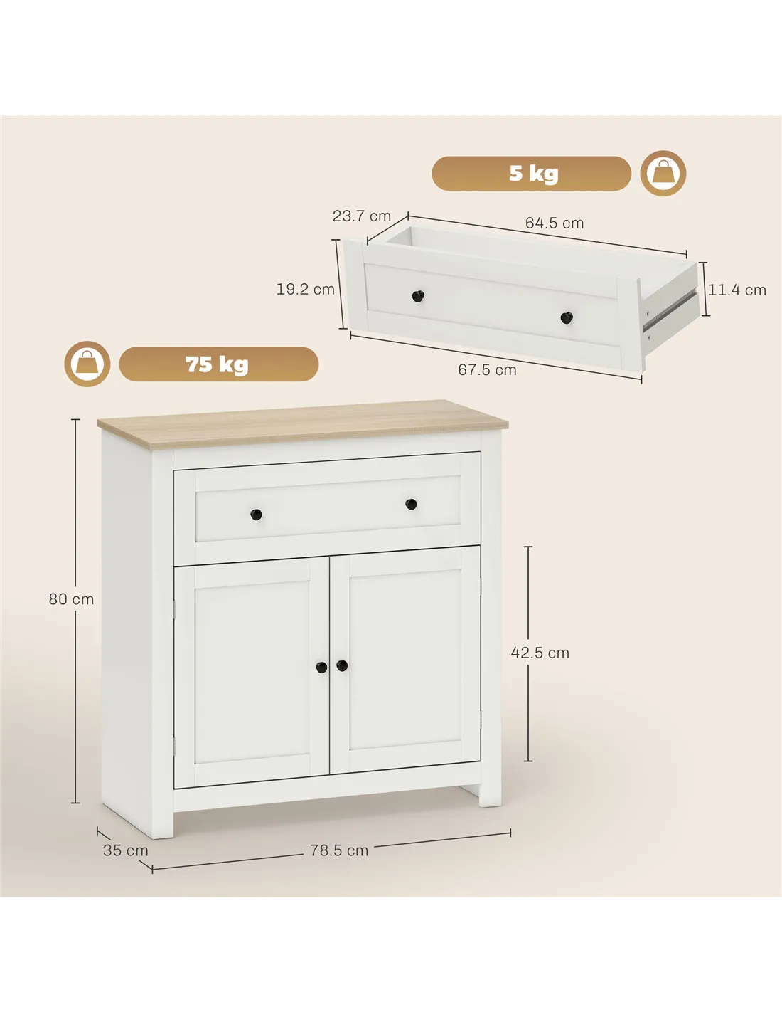 Achieve a clutter-free home with the HOMCOM Sideboard Storage Cabinet. This modern cream white unit provides essential storage for your kitchen, dining room, or living space. It features a spacious drawer and a double-door cabinet, complete with an adjustable internal shelf. Neatly store dishes, wine bottles, or household gadgets, maintaining a tidy environment. Its contemporary design with metal handles seamlessly integrates into any UK home decor. Crafted from durable, easy-to-clean melamine-faced particleboard, this cabinet offers long-lasting utility. An included anti-tip kit ensures enhanced stability and safety for your family. Measuring 78.5W x 35D x 80H cm, this versatile sideboard offers practical storage solutions without compromising on style, making daily routines simpler and family gatherings more enjoyable. Assembly is required for this functional and stylish furniture piece, designed to meet your household organisation needs effectively.Features: