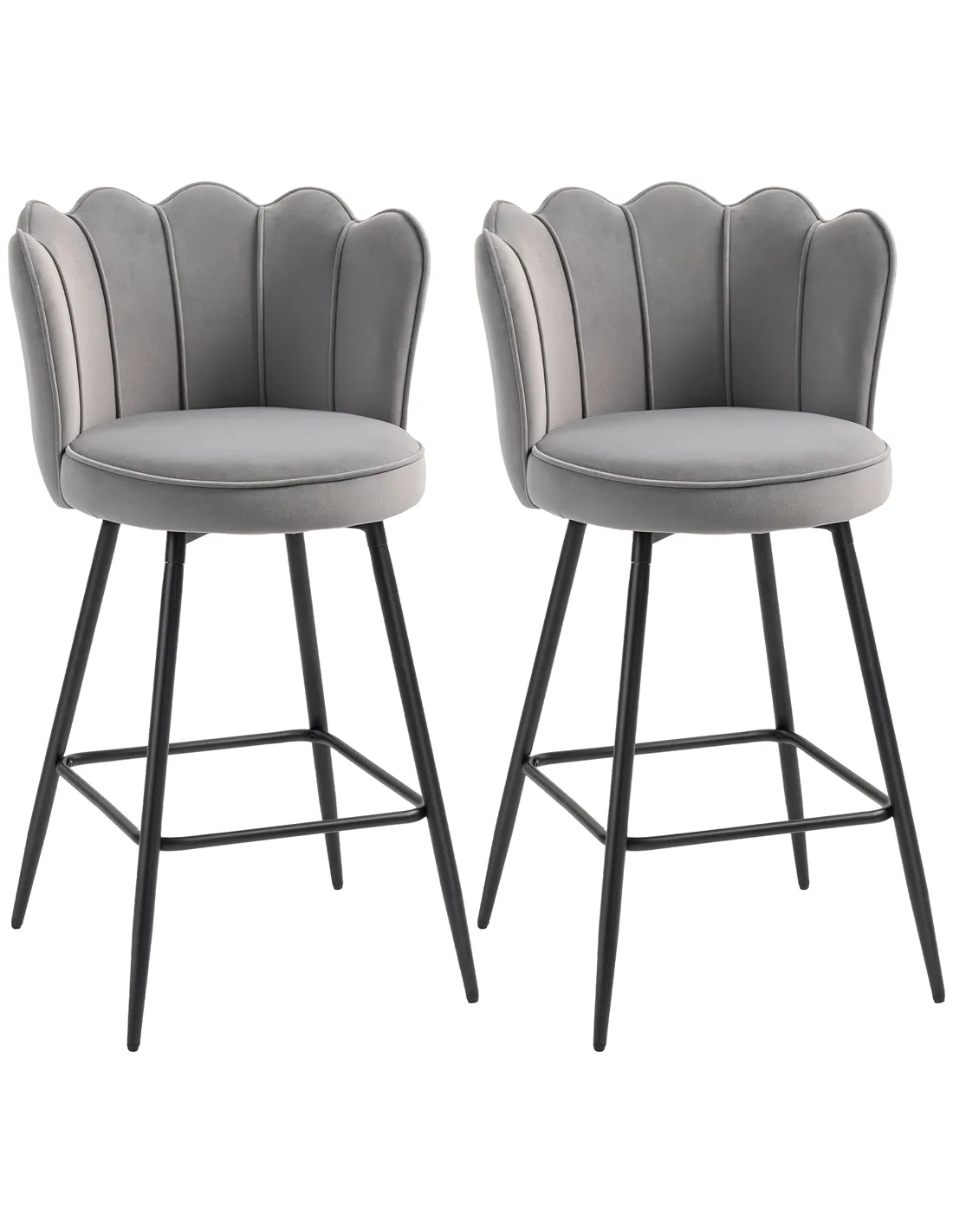 HOMCOM Set of Two Velvet-Feel Lotus Bar Stools - Grey