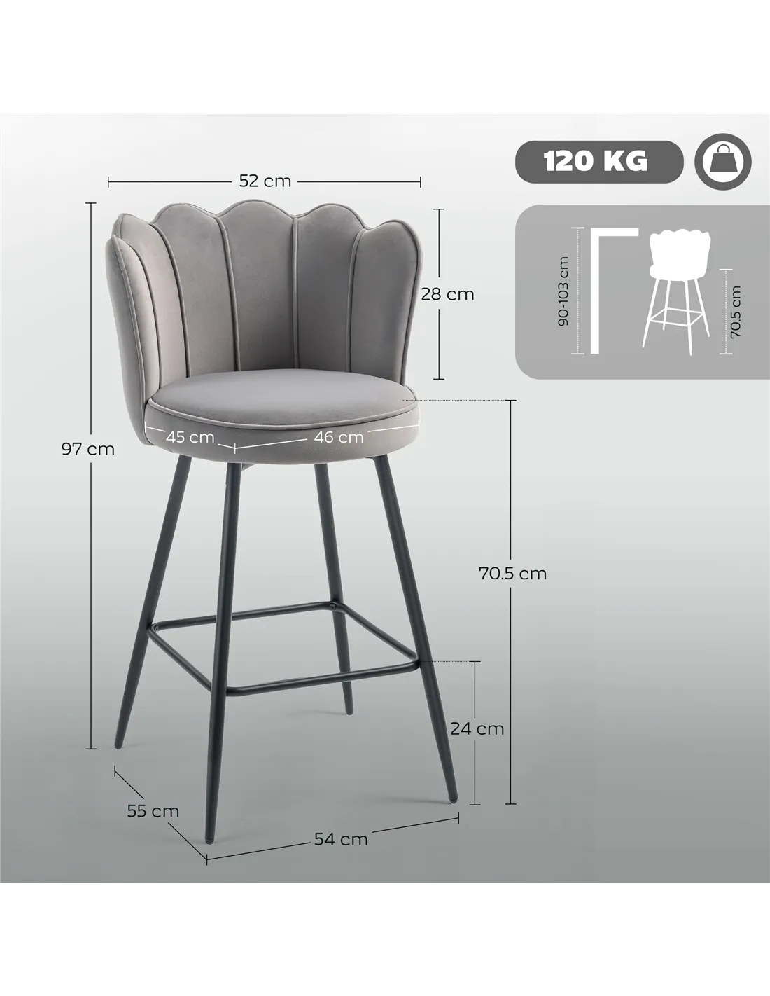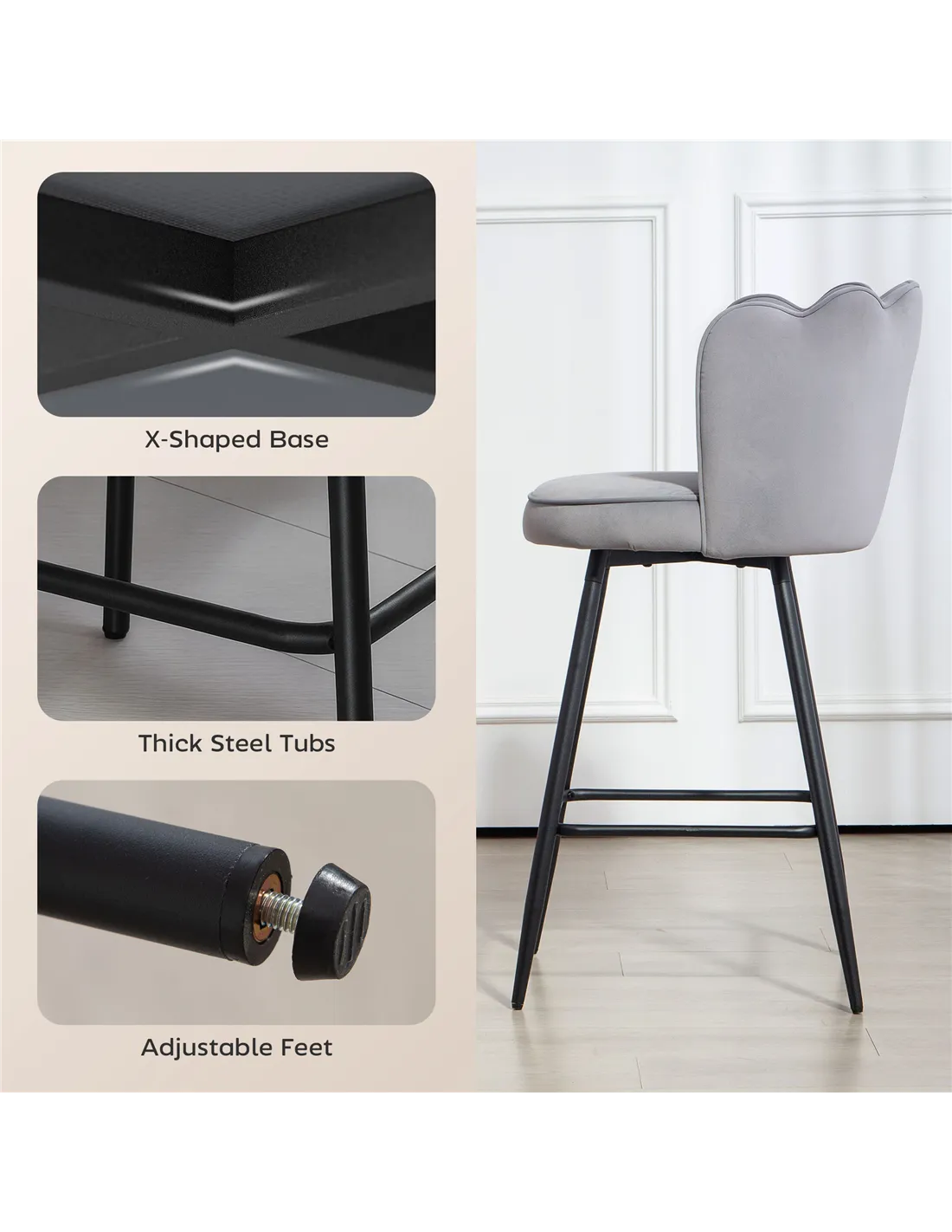 Elevate your kitchen or dining area with the HOMCOM Set of Two Velvet-Feel Lotus Bar Stools in Grey from FastDaddy. These bar stools combine sophisticated design with practical comfort. Each stool features a distinctive lotus-shaped back and soft velvet-feel upholstery, creating an elegant focal point for your home. Enjoy optimal support and relaxation with thickly padded, high-density sponge seating and high backs. Robust steel legs provide stable support, complemented by a convenient lower footrest. Adjustable feet ensure perfect balance on various floor surfaces. Designed for safety, the chairs use flame-retardant fabric and sponge. This matching pair offers a coordinated look, transforming your space with style and functionality. They withstand loads up to 120 kg per chair. Assembly is straightforward. These stools are a stylish, comfortable addition to your modern living space.