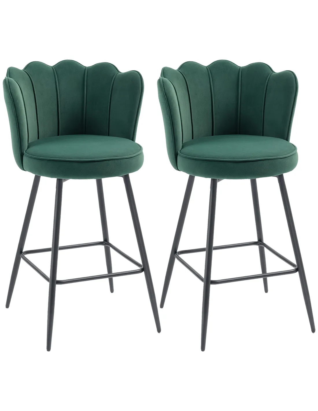 HOMCOM Set of Two Velvet-Feel Lotus Bar Stools - Dark Green