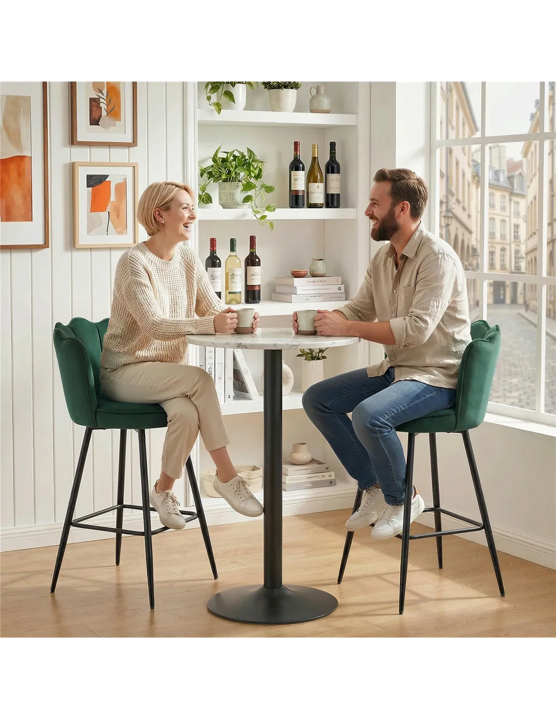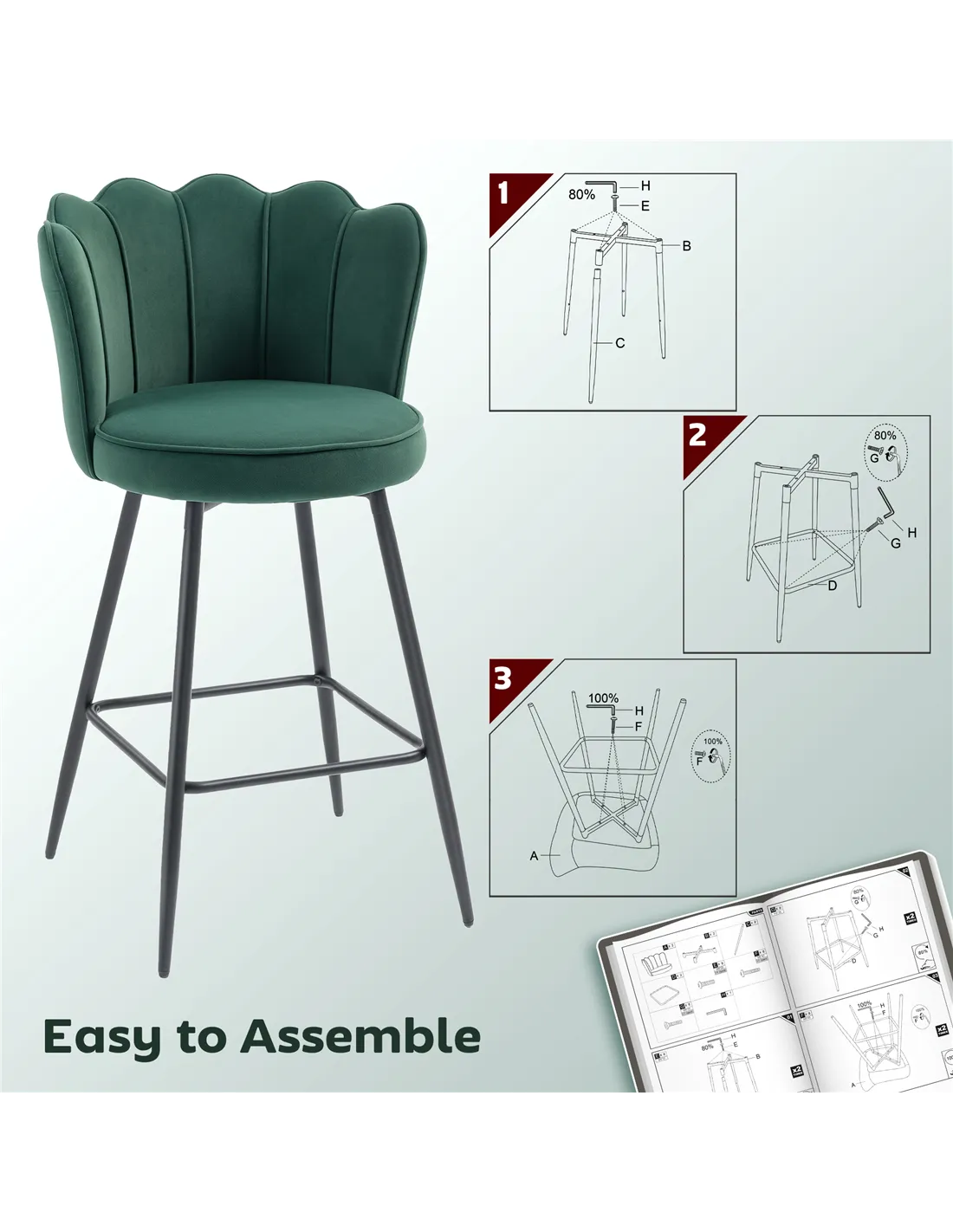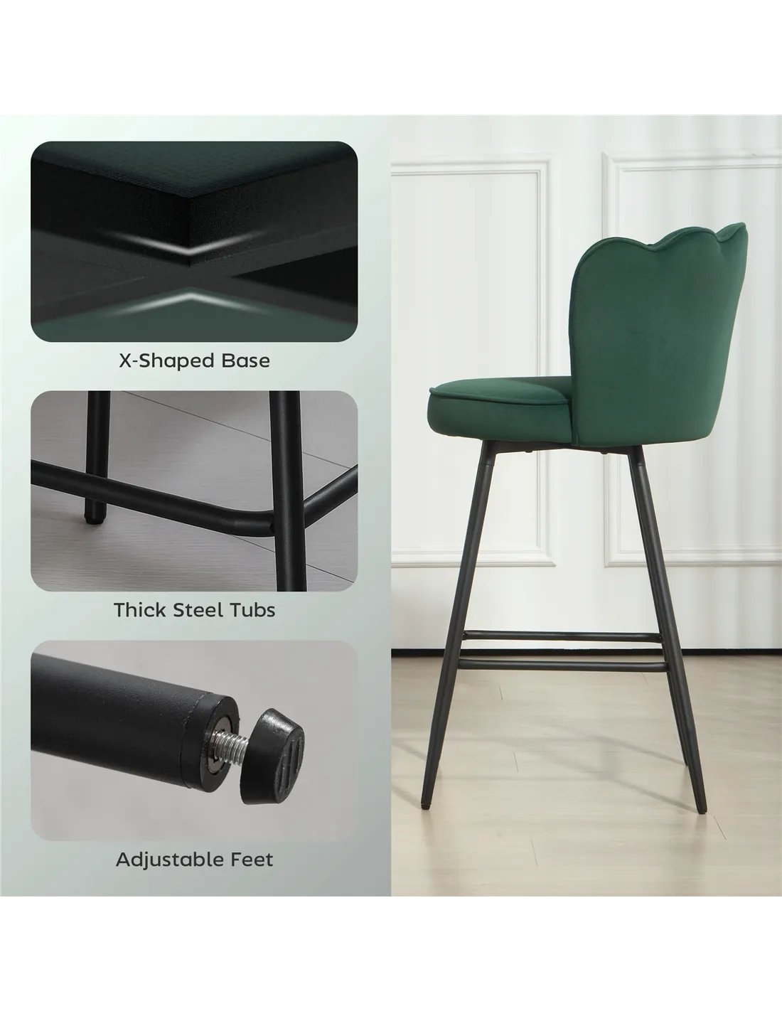 Introduce elegance and comfort to your home with the HOMCOM Set of Two Velvet-Feel Lotus Bar Stools in Dark Green. These stylish chairs feature lotus-shaped backs and luxurious velvet-feel upholstery, creating a beautiful focal point for your kitchen, dining area, or home bar. Each stool provides exceptional comfort, padded with thick, high-density sponge and designed with a high backrest for support. The robust steel legs ensure strong stability, while adjustable feet maintain perfect balance on any surface. Enjoy spacious seating with the wide armless design and a convenient lower footrest. Made with flame-retardant fabric and sponge, these bar stools meet safety standards. Each chair supports a maximum load of 120 kg and assembly is straightforward. Upgrade your space with coordinated, elegant seating from FastDaddy.