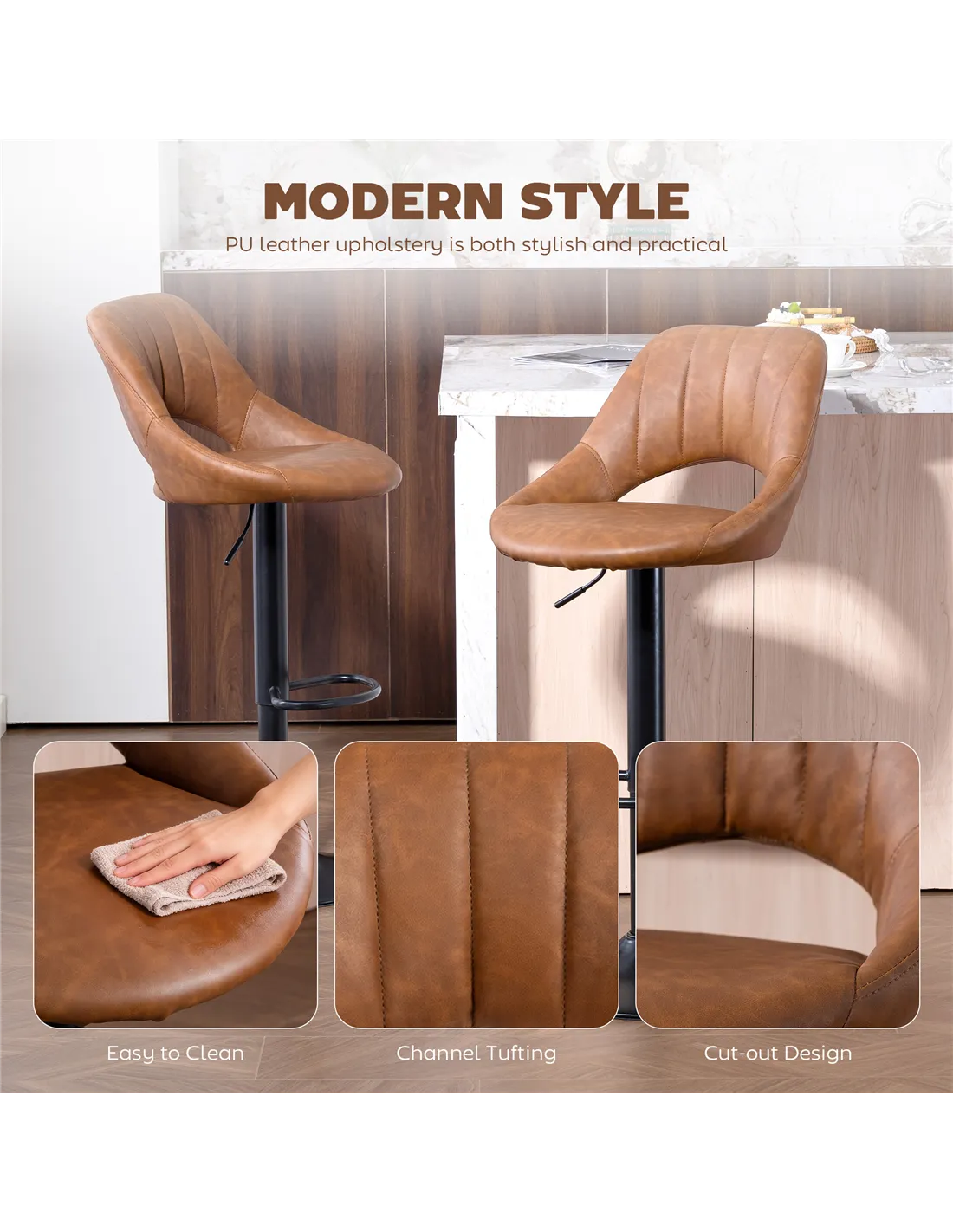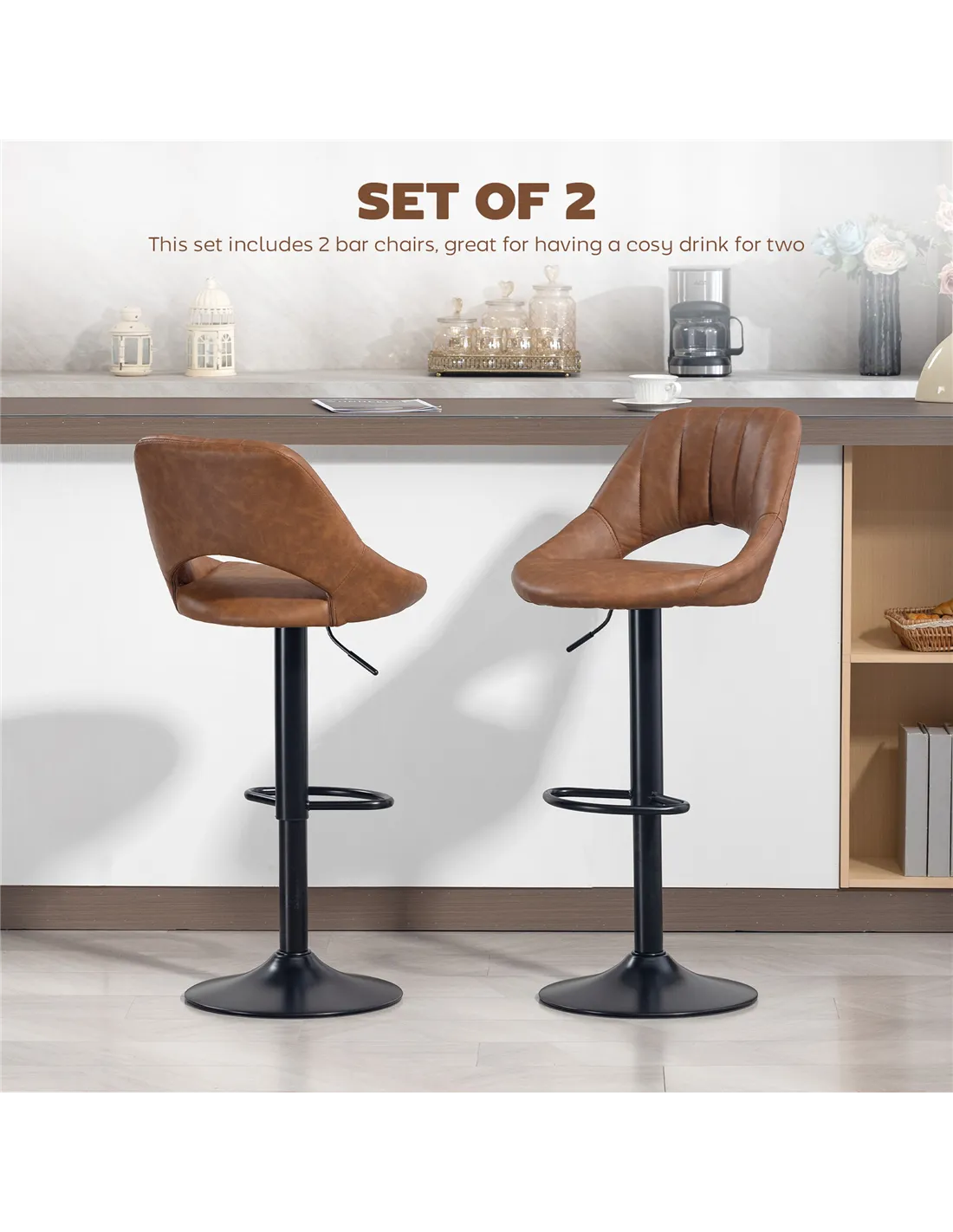 Elevate your kitchen or bar area with the HOMCOM Bar Stools Set of 2. These brown PU leather swivel barstools offer both style and function for UK homes. Adjust the seat height from 87 to 109 cm. This ensures a perfect fit for various kitchen counters or breakfast bars. Enjoy full mobility with the 360° swivel design, allowing easy movement. Each stool features a supportive backrest and an integrated footrest for enhanced comfort during extended use. Thick 8 cm foam padding, covered in smooth faux leather upholstery, provides a comfortable seating experience. The faux leather is also easy to wipe clean. A strong steel frame with a stable round base ensures durability and safety. Non-slip rubber pads on the base protect your floors from scratches. This two-piece set adds a coordinated, comfortable solution to your home.