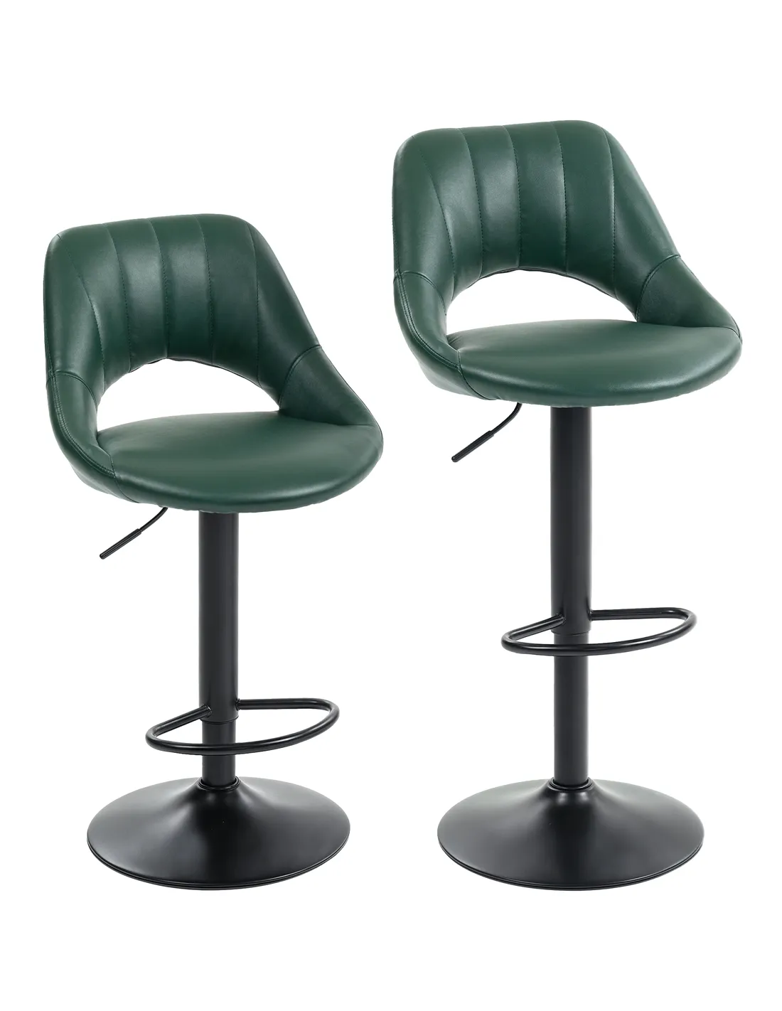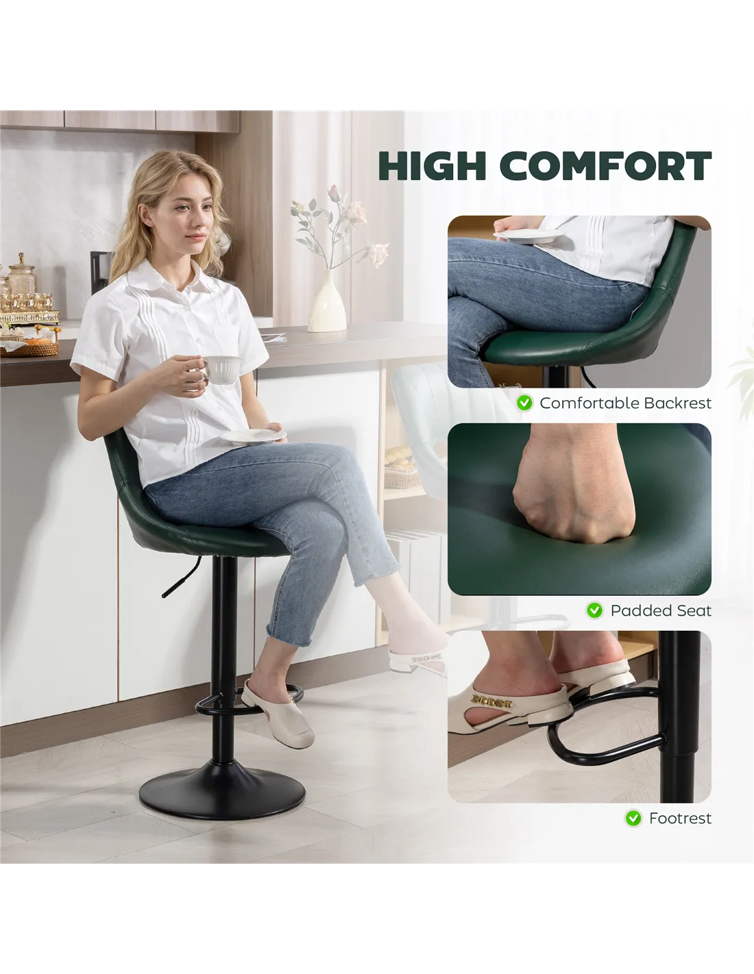 Enhance your kitchen or bar with the HOMCOM Set of Two Faux Leather Bar Stools. These dark green stools deliver modern style and practical functionality to your UK home. Adjust the height smoothly from 87 cm to 109 cm, achieving your ideal seating level. The 360° swivel offers complete freedom of movement for effortless interaction. Experience superior comfort from the 8 cm thick foam padded seats, upholstered in smooth, cool faux leather. A strong steel frame ensures stability, complemented by a comfortable footrest. These durable bar stools are designed for daily use, supporting up to 120 kg. Their elegant dark green finish brings a sophisticated touch, while the easy-to-clean surface simplifies maintenance. Introduce a coordinated, comfortable seating solution to your living space with this stylish set.
