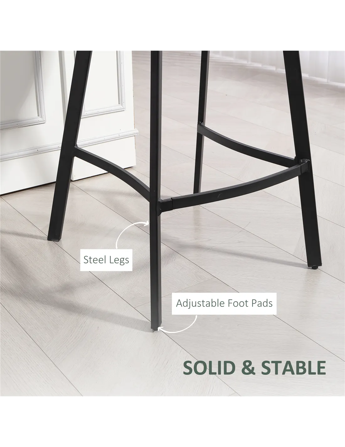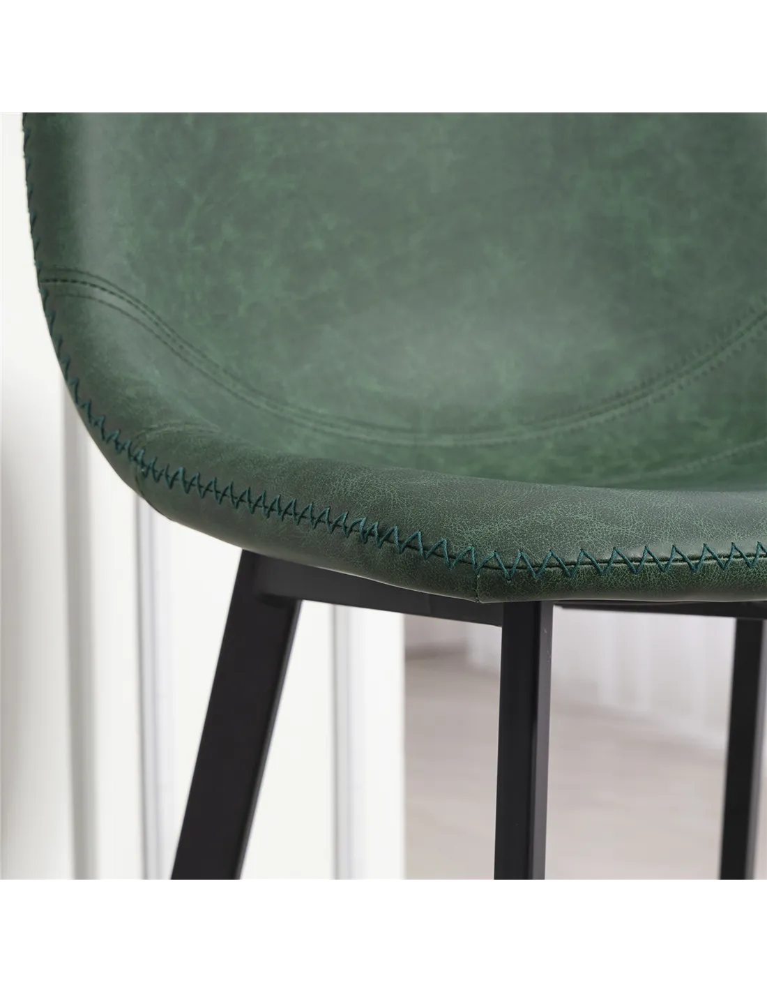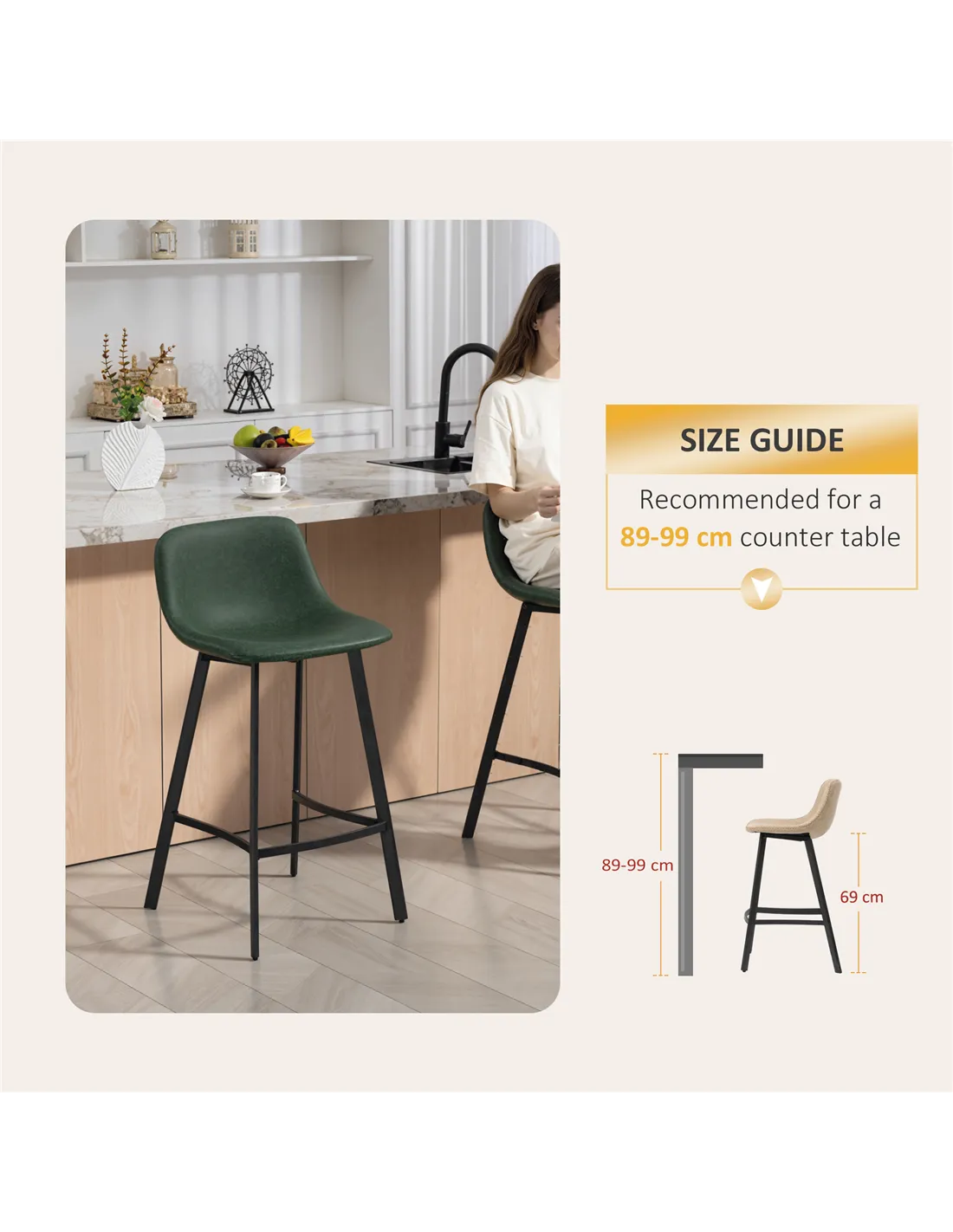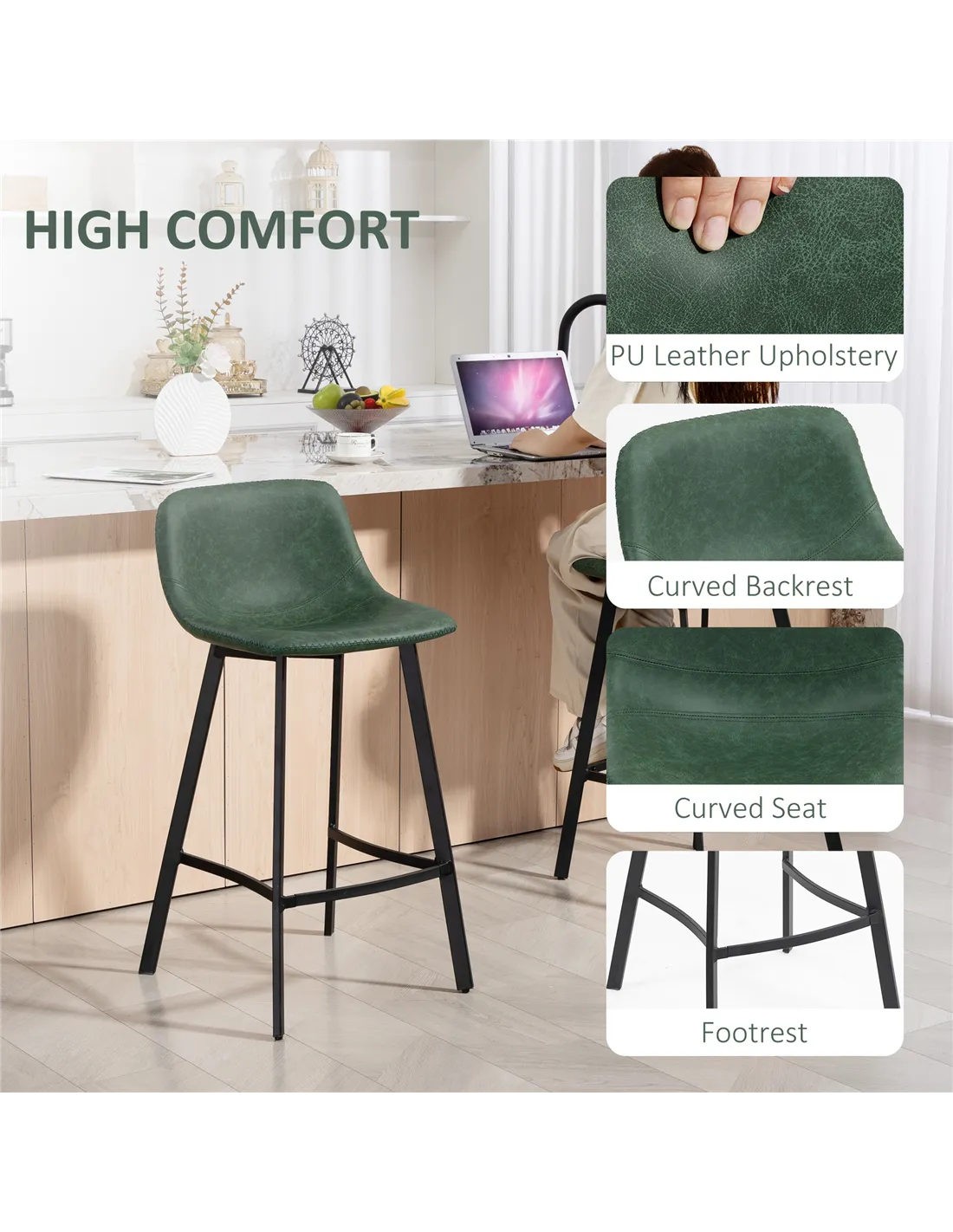 Introduce versatile seating to your kitchen, counter, or breakfast bar with this set of two HOMCOM bar stools. Designed for comfort, these green PU leather dining stools feature curved seats and supportive backrests. The smooth faux leather upholstery provides a sleek aesthetic for any home setting. Each stool integrates a practical footrest, allowing for relaxed leg positioning during meals or casual use. Constructed with a durable, powder-coated steel frame, these stools offer reliable support and long-lasting stability. Adjustable foot pads ensure each unit remains steady and perfectly balanced on various floor types. This pair of bar stools creates a functional and inviting atmosphere, providing a comfortable and secure seating option for you and your guests.
