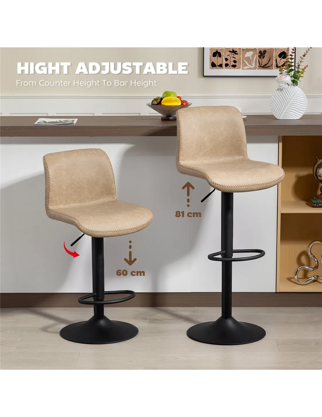 Discover the HOMCOM Bar Stools Set of 2 in light brown, an ideal addition for your kitchen, counter, or breakfast bar. These PU leather barstools offer both modern style and practical functionality for UK homes. Each stool features adjustable height, ranging from 85 cm to 106 cm, accommodating diverse counter levels. High-density foam seating, combined with a curved backrest, provides support for extended use. The integrated footrest further enhances comfort. Durability comes from a robust metal frame and a stable round base, ensuring secure everyday seating. PU leather upholstery makes cleaning effortless, providing a waterproof surface. This set of two light brown barstools delivers a comfortable, stable, and easy-to-maintain seating solution, perfect for meals, drinks, or social gatherings.