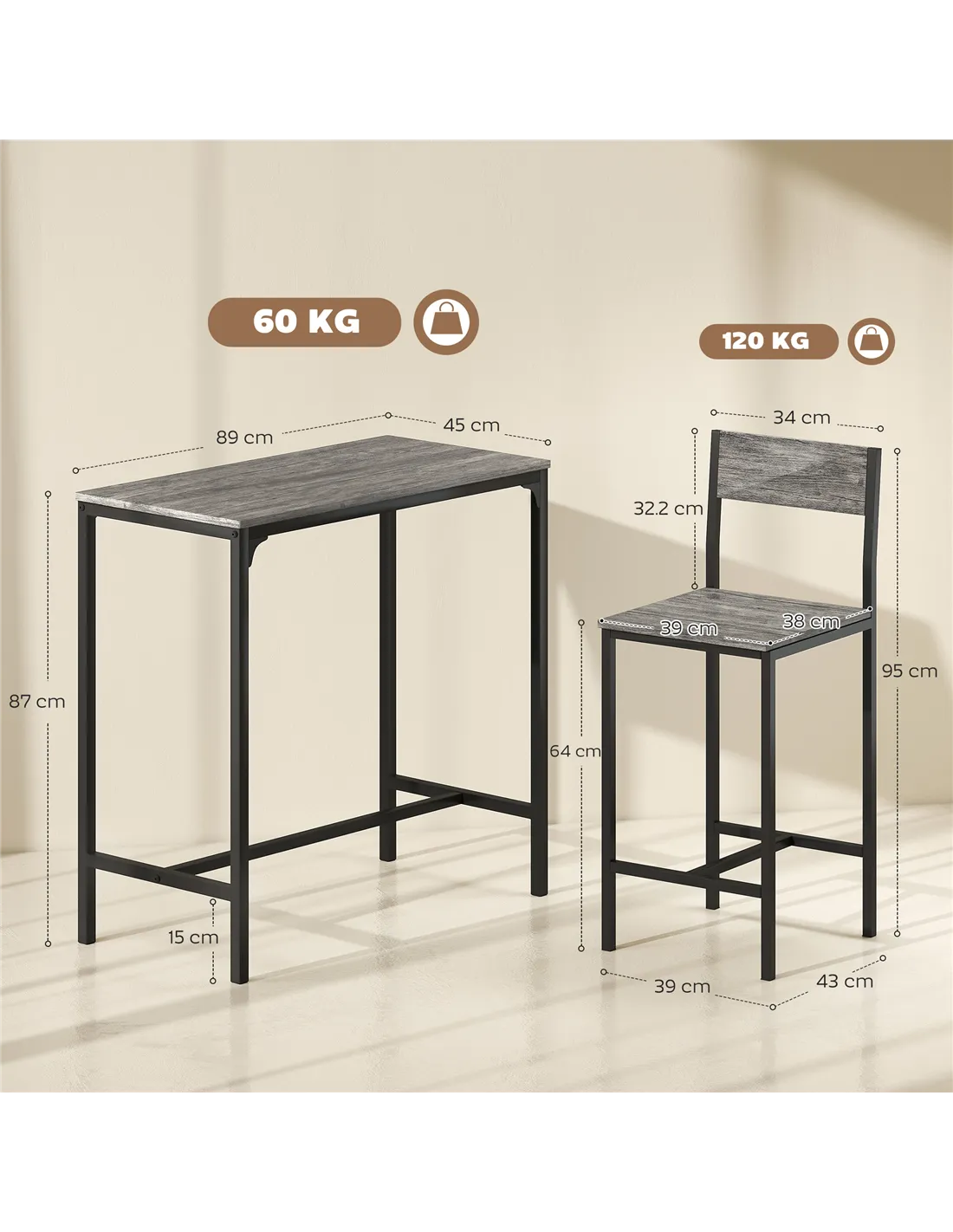 A: The bar table measures 89L x 45W x 87H cm, with a weight capacity of 60 kg. Each bar stool measures 39L x 43W x 95H cm, with a weight capacity of 120 kg.