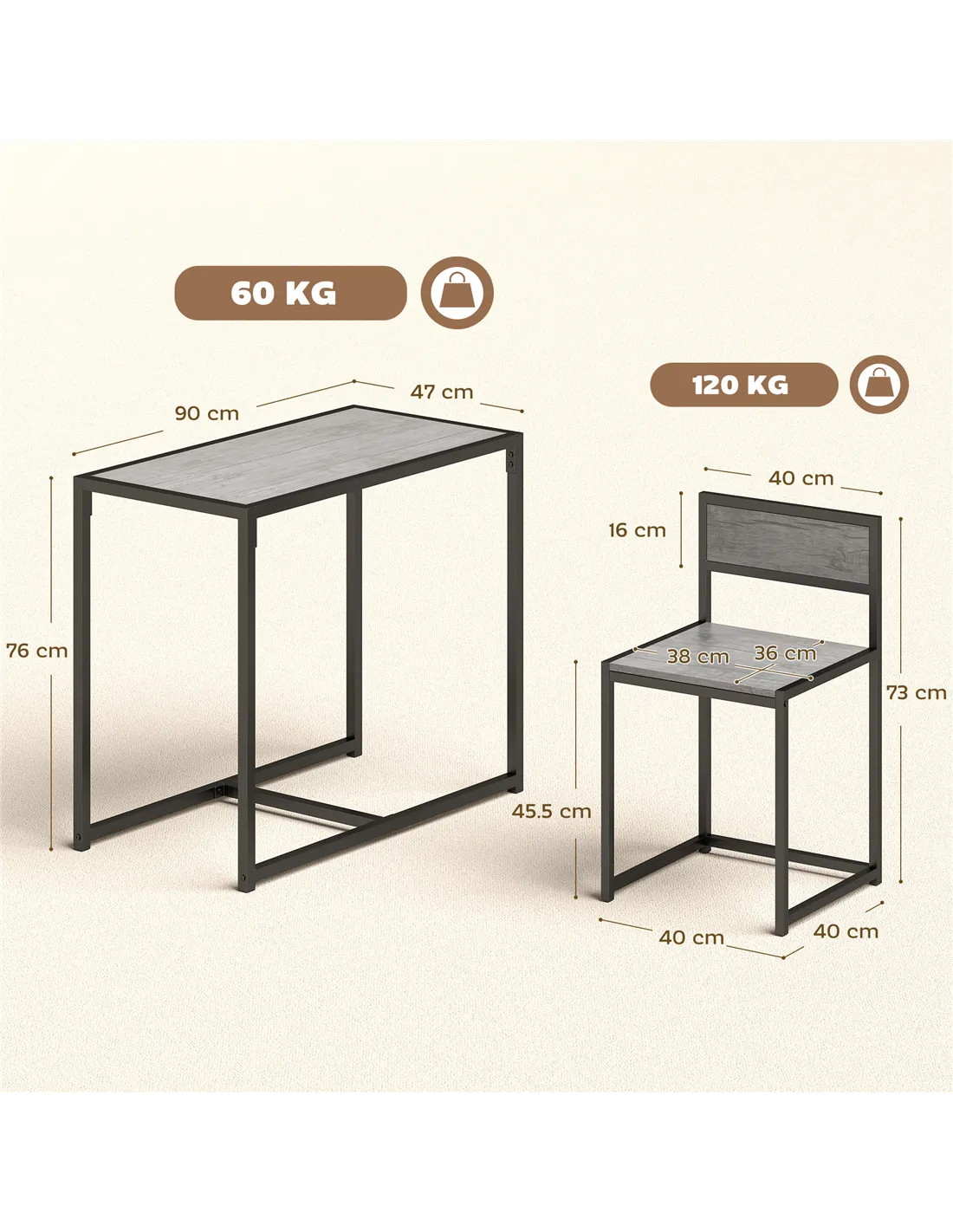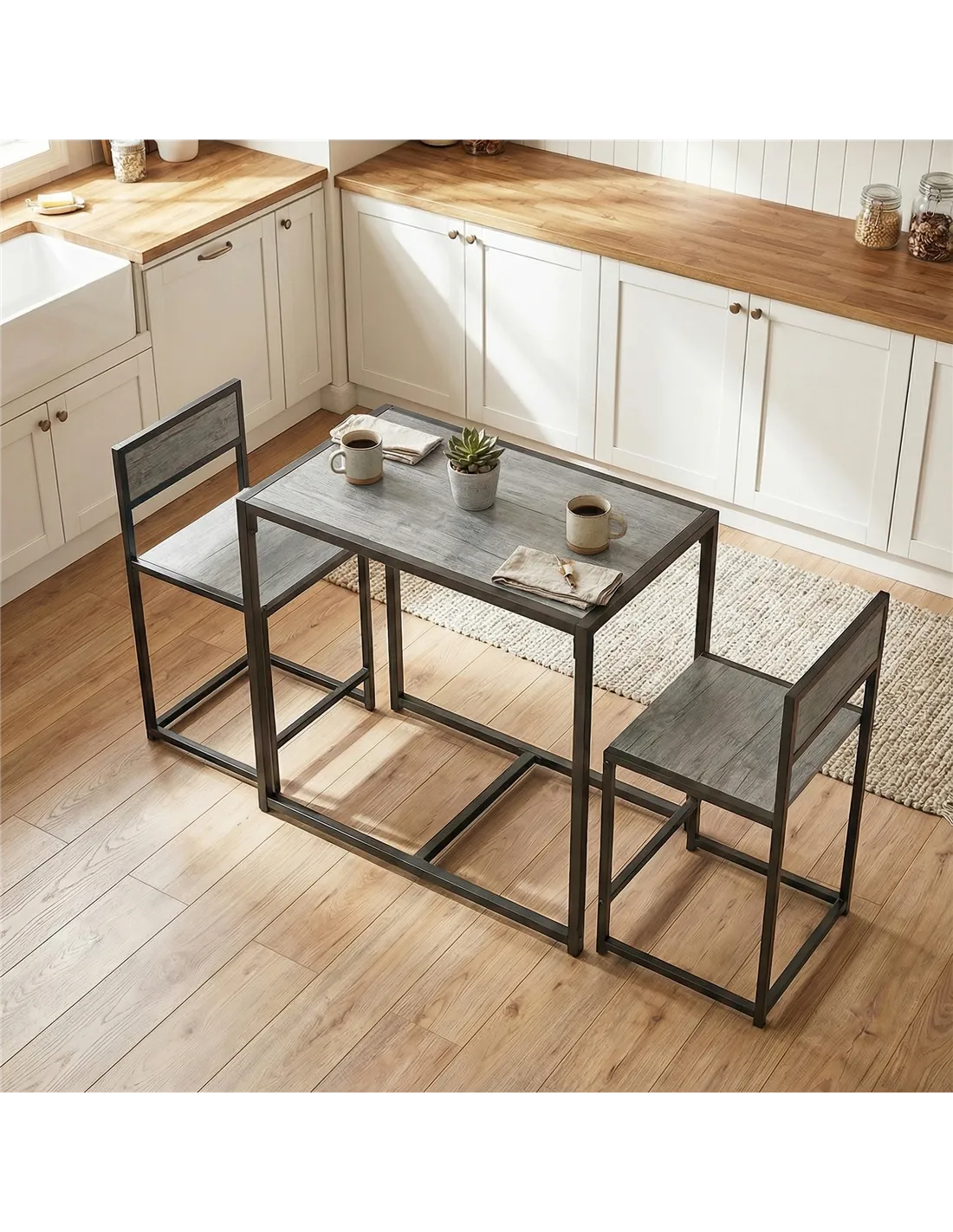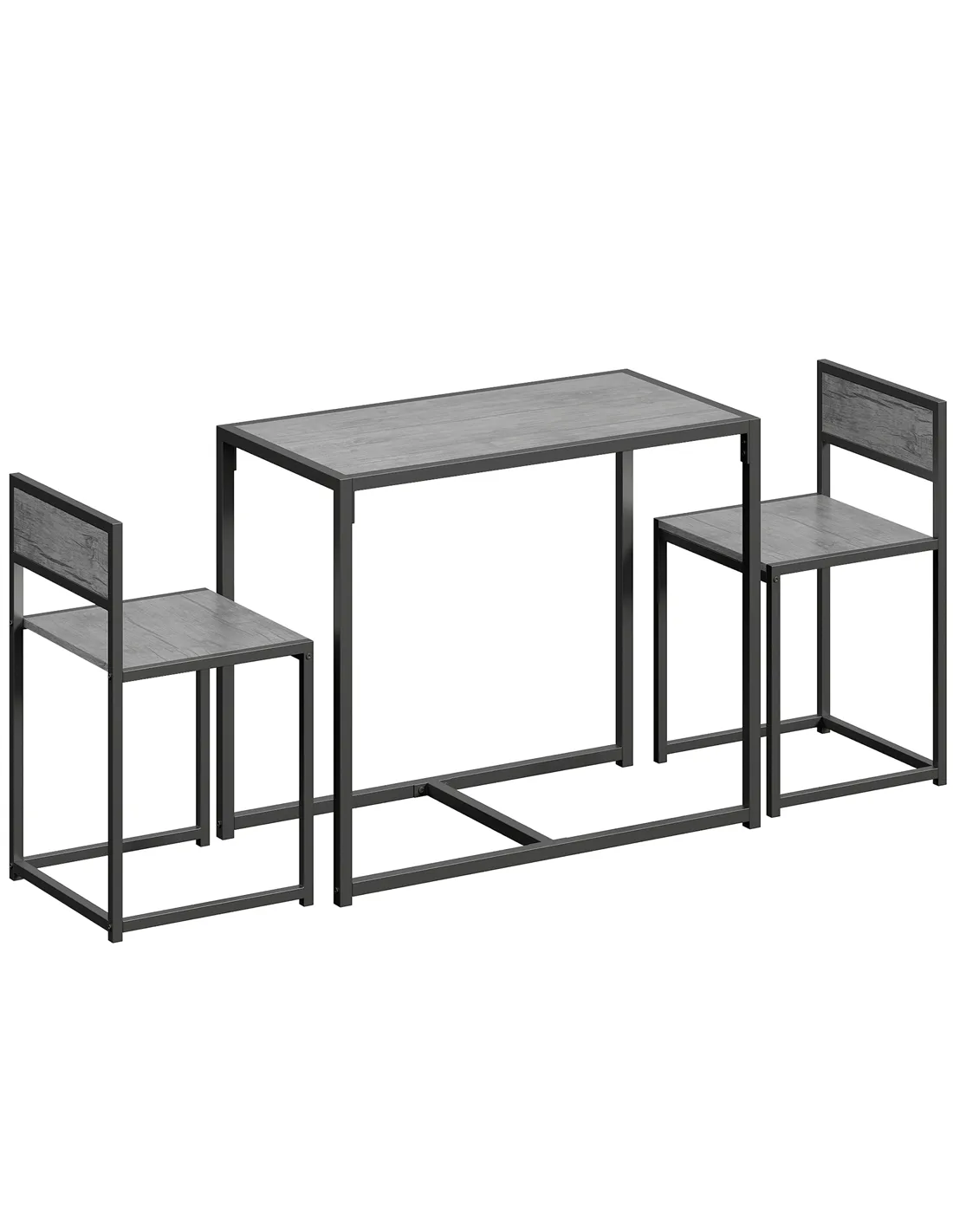 The HOMCOM 3 Piece Table Stool Set, in charcoal grey wood-effect, provides a functional dining solution for your UK home. This compact furniture package includes one rectangular table and two coordinated stool-style chairs. Its robust steel frame, finished in black, ensures strength and durability for consistent daily use in your kitchen or conservatory. The MDF panels incorporate a protective top coat. This shields surfaces from light water and scratch damage, making the set suitable for busy lifestyles. The innovative design allows the two chairs to tuck neatly under the table. This feature provides substantial space-saving benefits for smaller living areas. You gain a practical, stylish, and easily maintained dining option, designed for modern living.