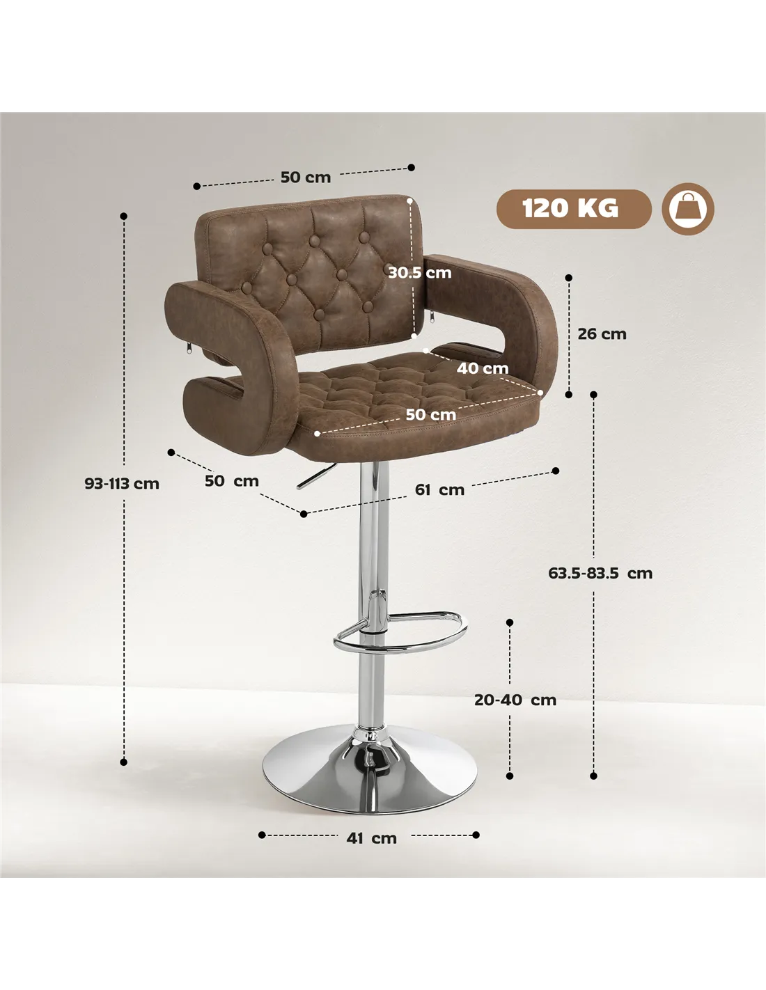 - A: This HOMCOM bar stool supports a maximum load capacity of 120 kg.