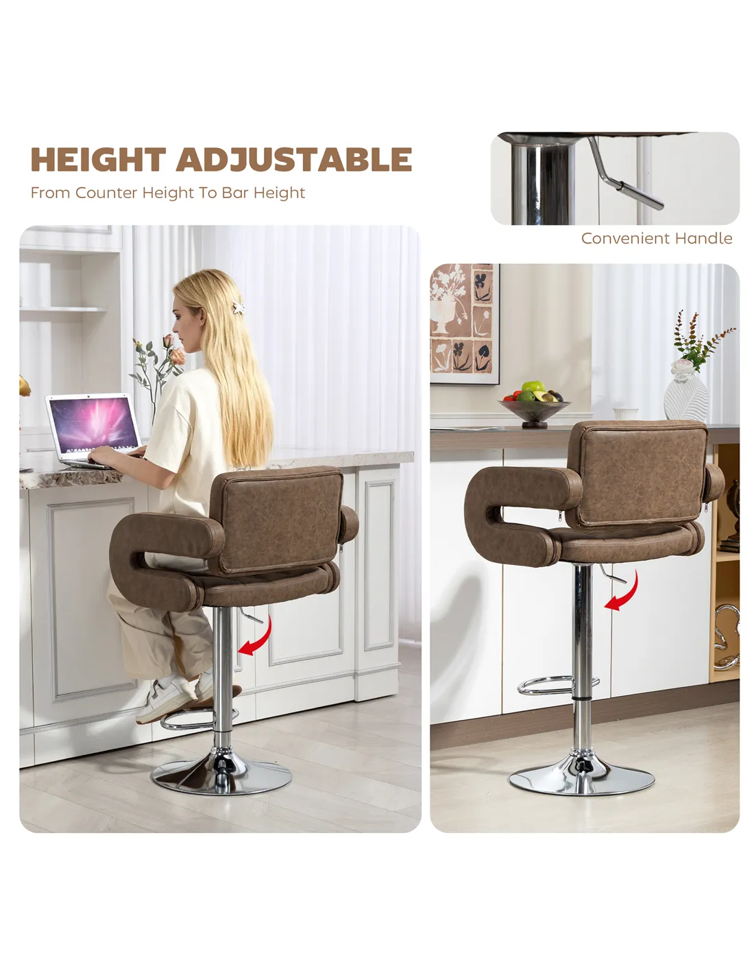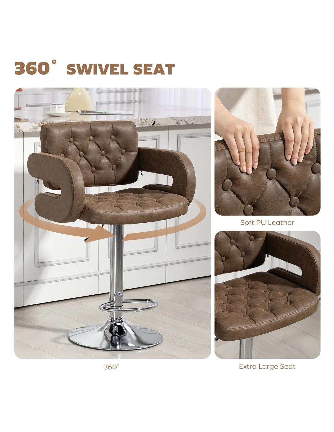 Elevate your kitchen or lounge with the HOMCOM PU Leather Upholstered Swivel Bar Stool. This coffee-coloured stool delivers adaptable seating for your home. It features a full back, supportive armrests, and a convenient footrest, ensuring comfort during extended use. Adjust the seat height effortlessly from 63.5 cm to 83.5 cm, fitting various counter and bar levels. Its 360° swivel seat offers full freedom of movement, responding to your body. Upholstered in faux leather with elegant tufting, this stool provides a modern style. The padded seat and high back contribute to its comfortable design. A robust steel base includes a handy footrest and foot pad, protecting your floors from marks. Designed for stability and durability, it supports a maximum load of 120 kg. This HOMCOM bar stool combines aesthetic appeal with practical functionality. It makes a suitable addition to any contemporary room decor, from breakfast bars to lounge areas. Experience comfortable, versatile seating daily.