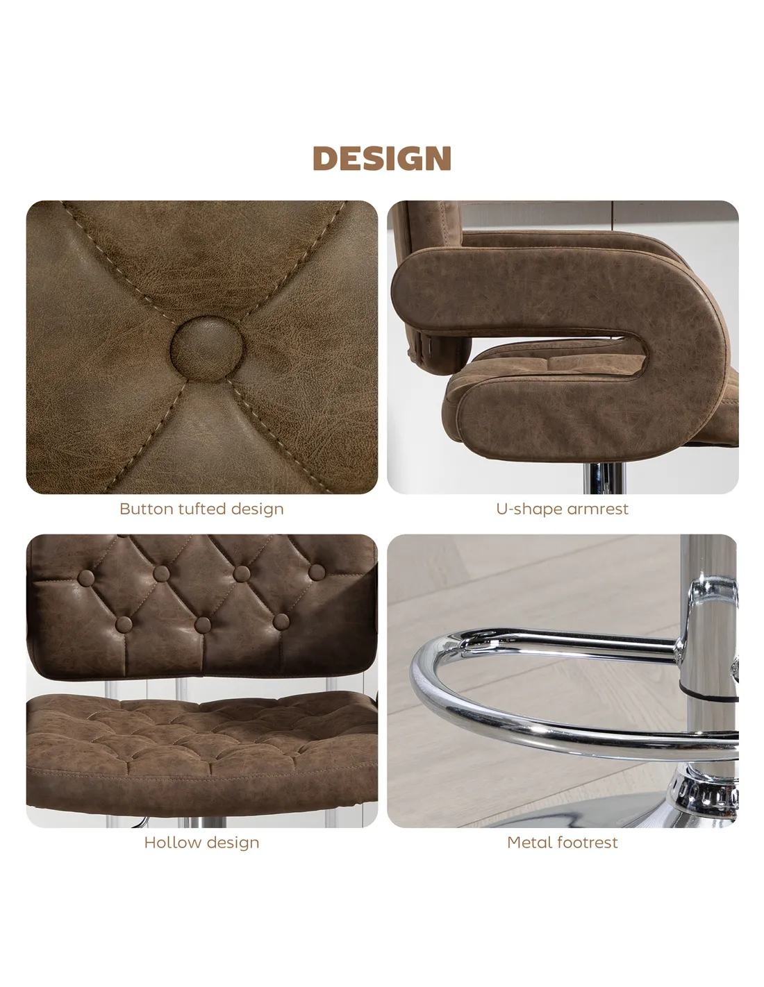 - A: The bar stool uses steel for its structure and PU leather for the upholstery.