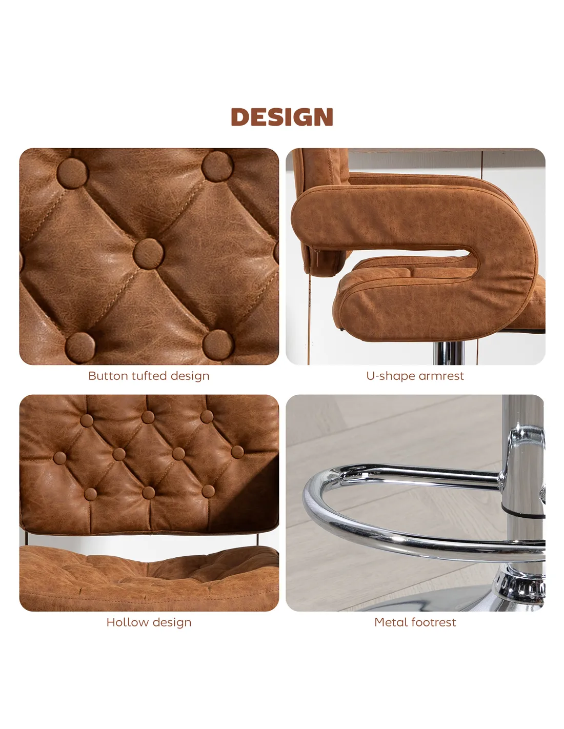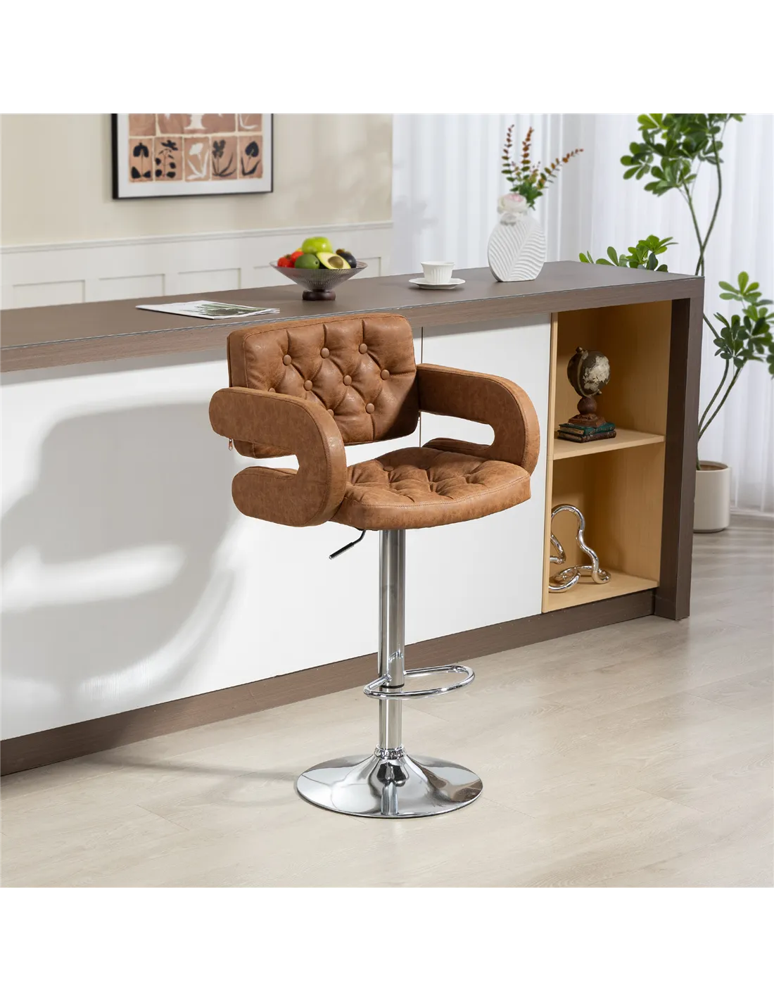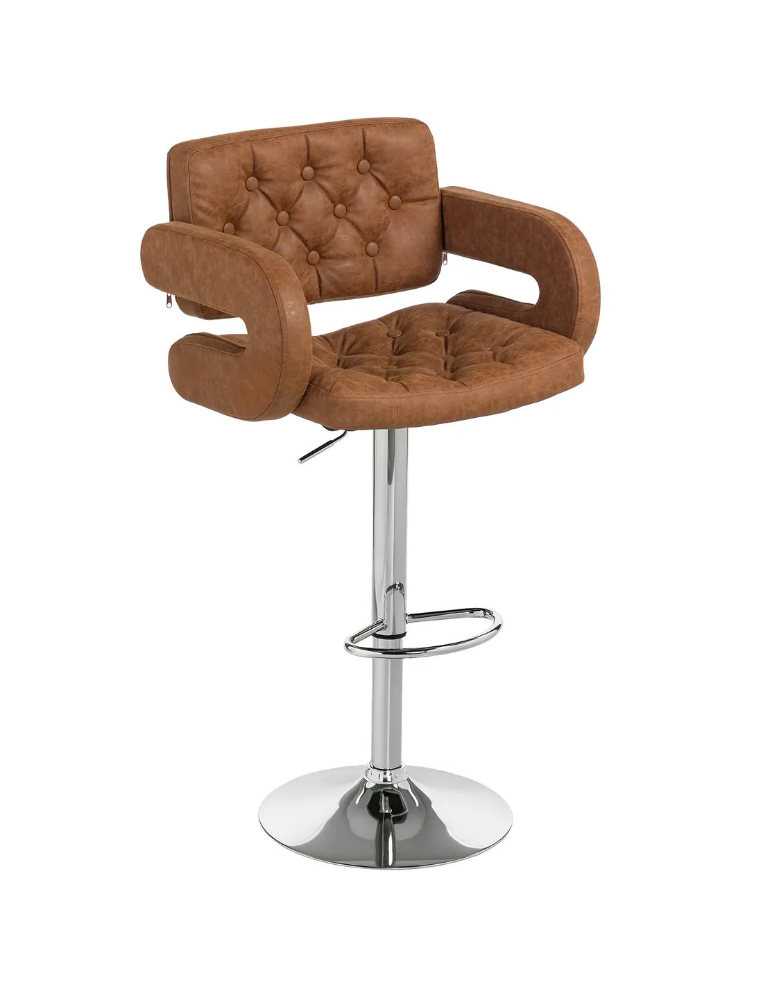 Elevate your home's aesthetic and comfort with the HOMCOM PU Leather Upholstered Swivel Bar Stool in brown, exclusively from FastDaddy. This modern, height-adjustable bar stool enhances any kitchen breakfast bar, lounge, or general room setting across the UK. It delivers robust functionality with its 360° swivel seat, allowing effortless movement and interaction. Experience superior seating comfort with its full back support, integrated armrests, and a practical footrest. The rich brown faux leather upholstery, featuring elegant tufting, offers a stylish, contemporary feel. A stable chrome-finished metal base supports the stool, including a protective foot pad to safeguard your floors. Designed for daily use, this bar stool provides a comfortable seating position adaptable to various counter heights, making it a functional and sophisticated addition to your living space. Maximum load capacity is 120 kg. FastDaddy ensures this chic seating solution meets your home decor needs.