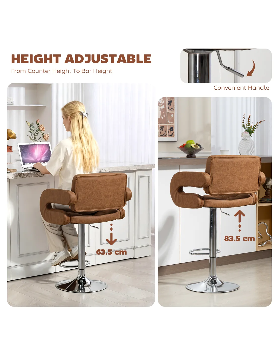 - A: The seat height adjusts from 63.5 cm to 83.5 cm, suitable for various counter levels.