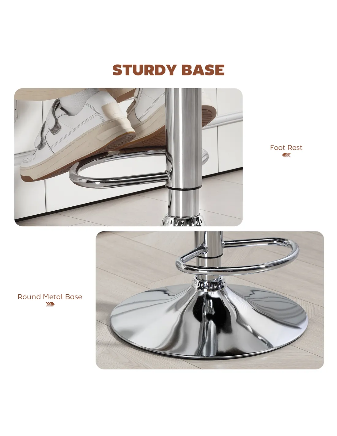 - Supportive metal base with handy footrest. Foot pad to gently protect floor from marks
