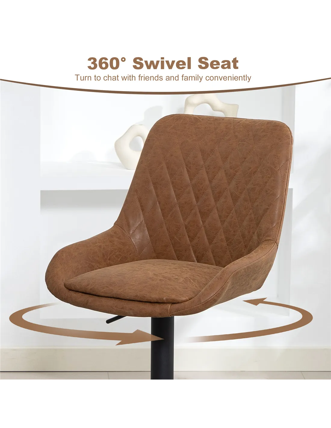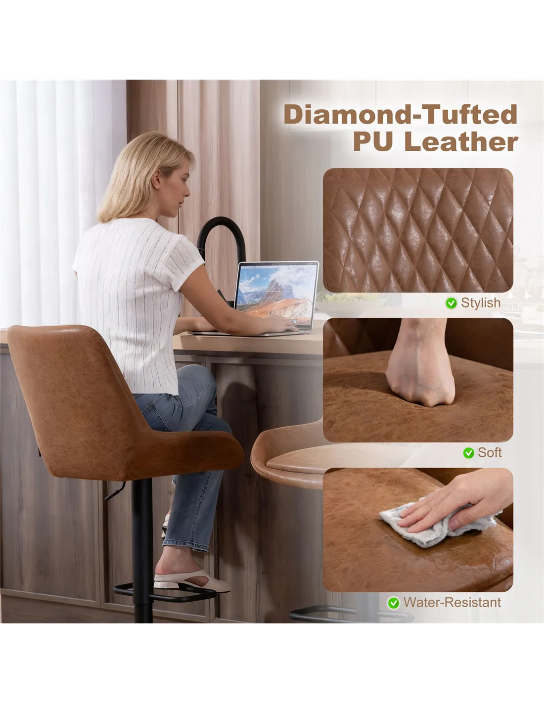 - Seat height is adjustable from bar height to counter height