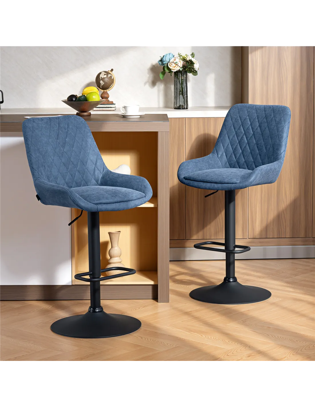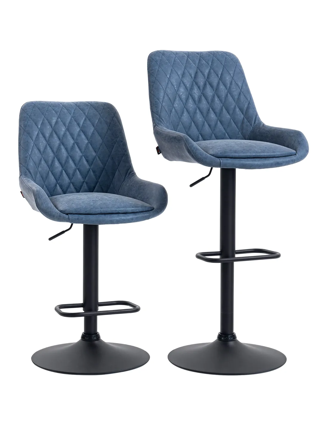 Elevate your UK kitchen dining area with the HOMCOM Set of Two Faux Leather Retro Bar Stools in Dark Blue from FastDaddy. These stylish stools offer a distinct vintage appeal, seamlessly blending into contemporary or classic interiors. Enjoy superior comfort with padded seats and supportive high backs, upholstered in durable faux leather with elegant diamond tufting. The robust powder-coated steel base ensures stability and longevity, supporting up to 120kg per stool. Adjust the seat height effortlessly from 63cm to 83cm, accommodating both bar height and counter height tables. A convenient 360° swivel function provides ease of movement, while the integrated footrest enhances seating posture. These dark blue bar stools arrive as a pair, ready to transform your home with practical design and enduring style.