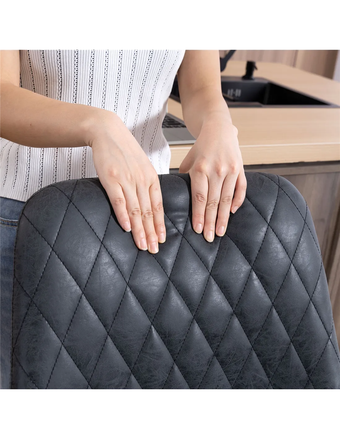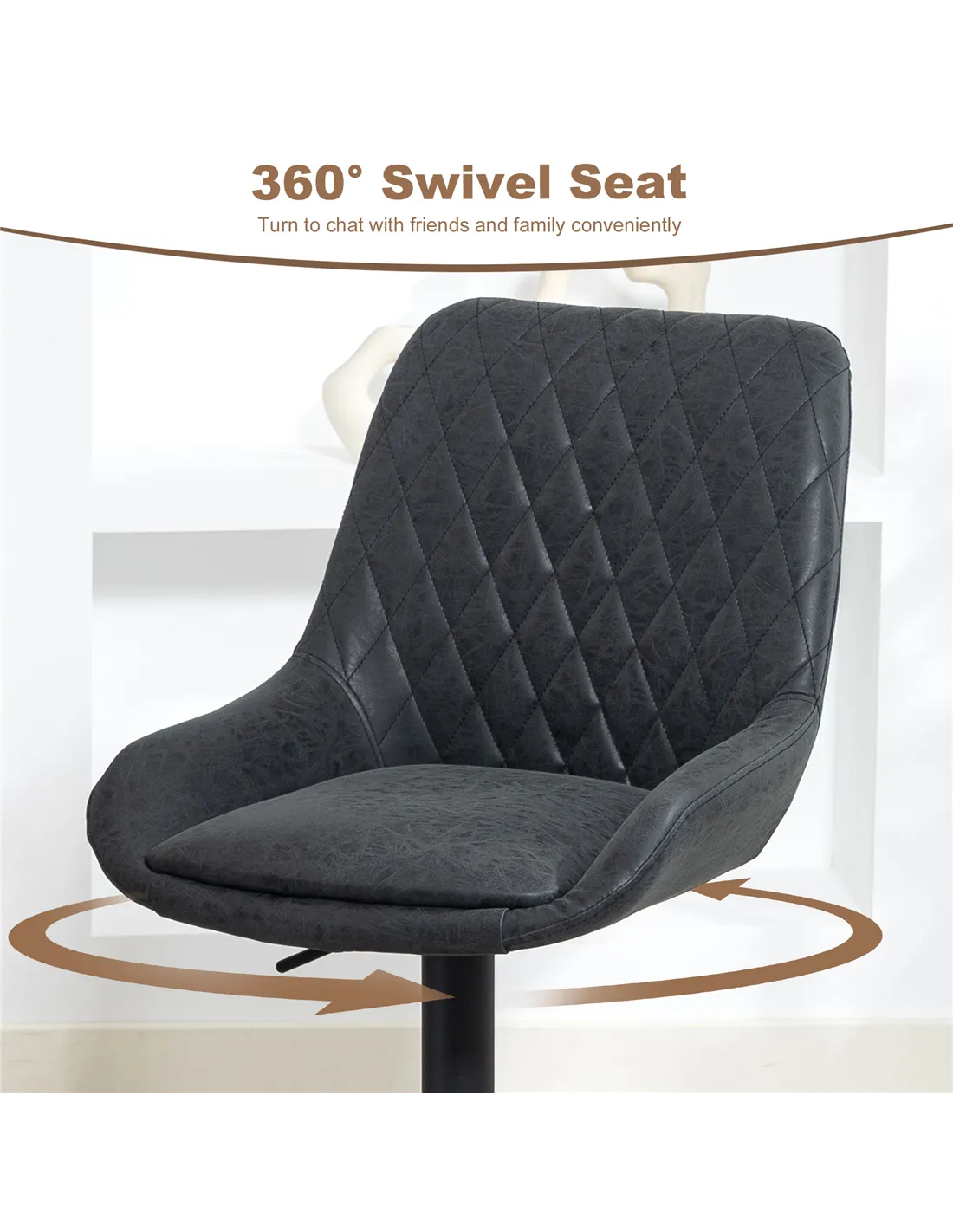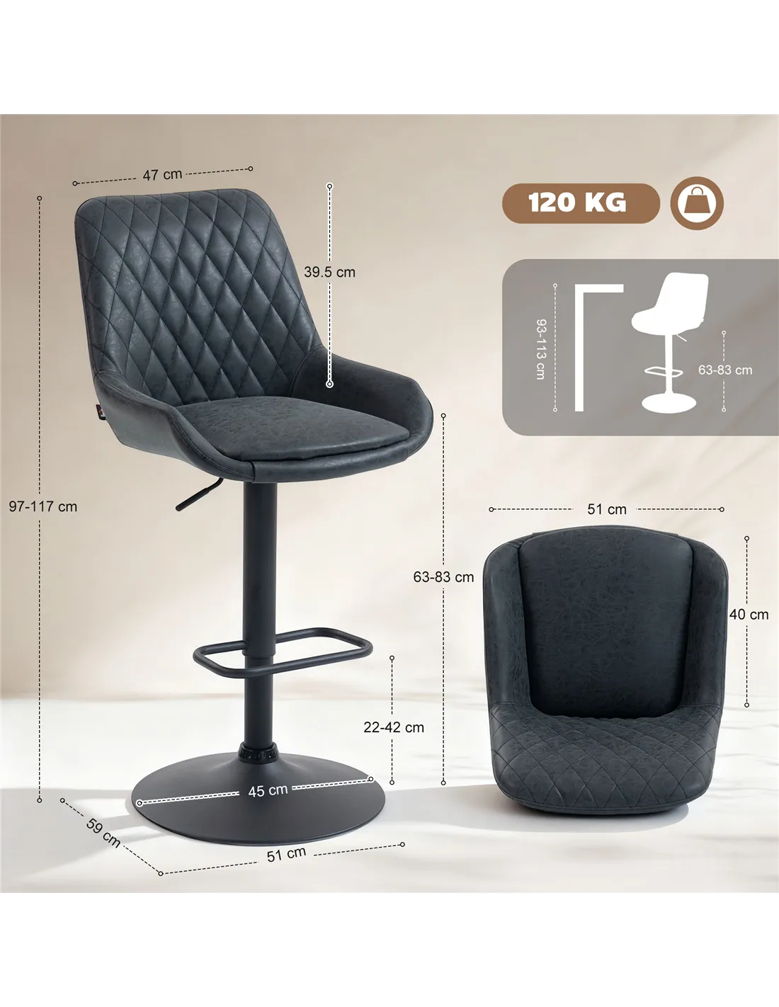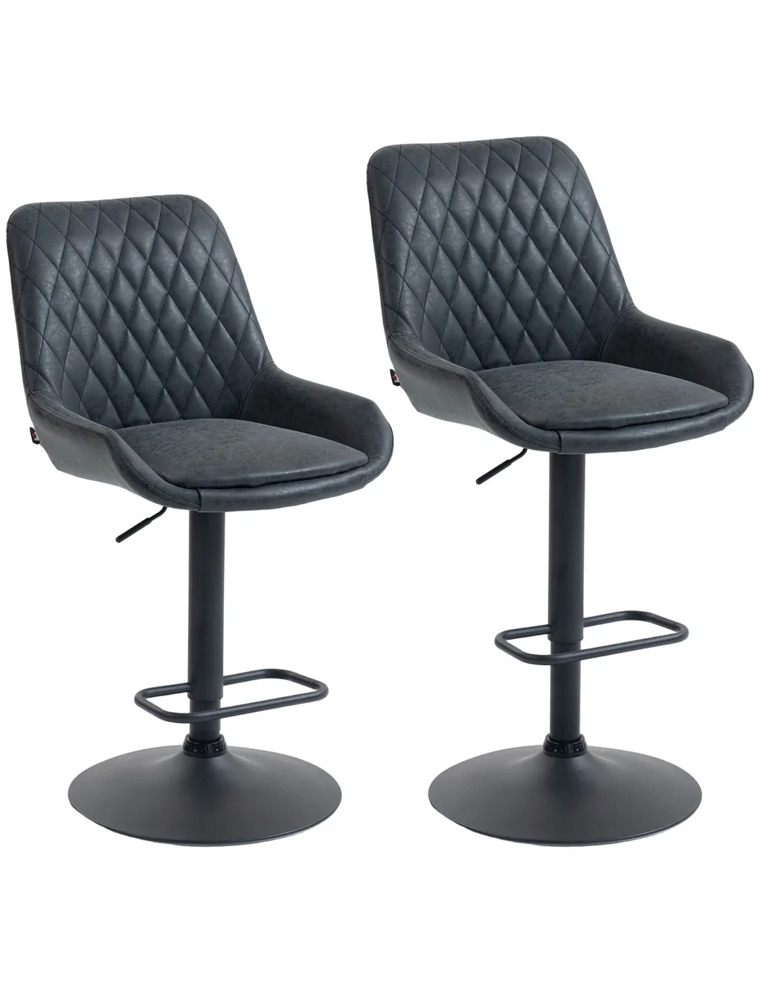 Upgrade your kitchen or dining area with the HOMCOM Set of Two Faux Leather Retro Bar Stools in Black. These stools deliver a stylish look for your home. Enjoy comfort with padded seats and high backrests, designed for support. The faux leather upholstery features diamond tufting, adding a cool, retro style. A robust, powder-coated steel base ensures stability. Adjust the seat height from 63cm to 83cm to match your counter or bar table, suitable for heights between 93cm and 113cm. A 360° swivel seat allows easy movement, complementing your body's motion. Each stool includes a handy footrest for added relaxation. These bar stools provide a coordinated seating solution, with a maximum load of 110kg per stool. Assembly is straightforward. FastDaddy brings you practical and stylish home furnishings for the UK.