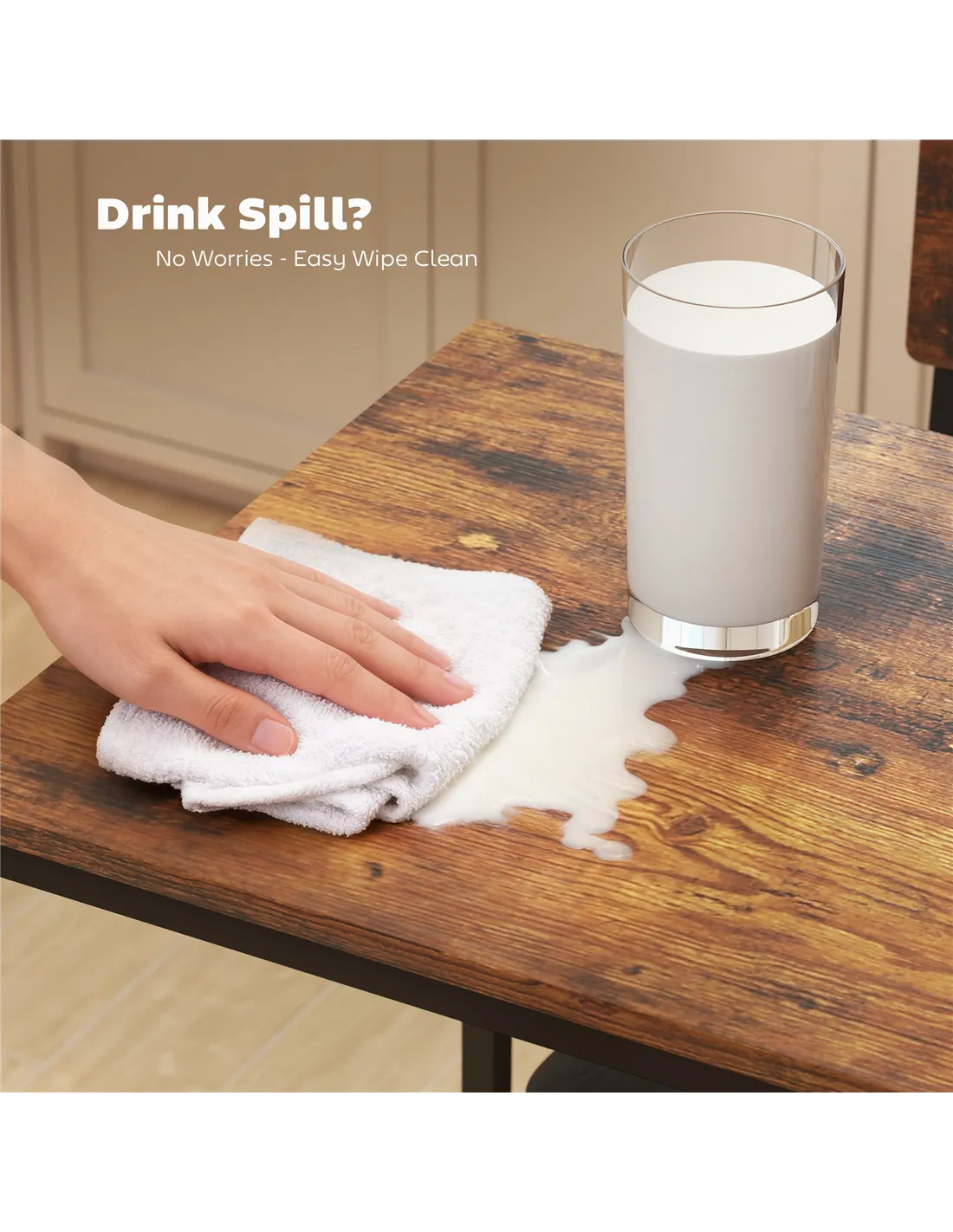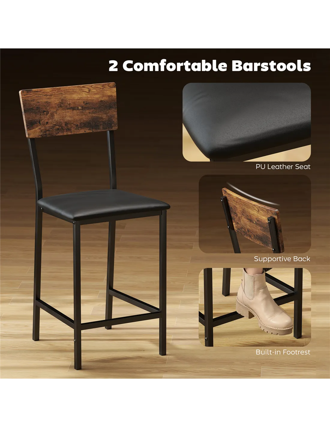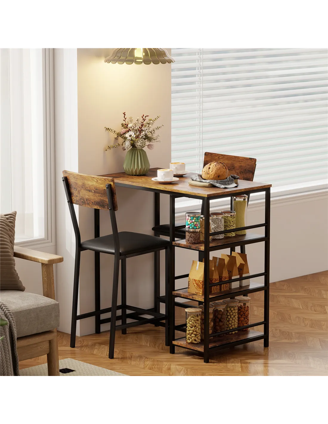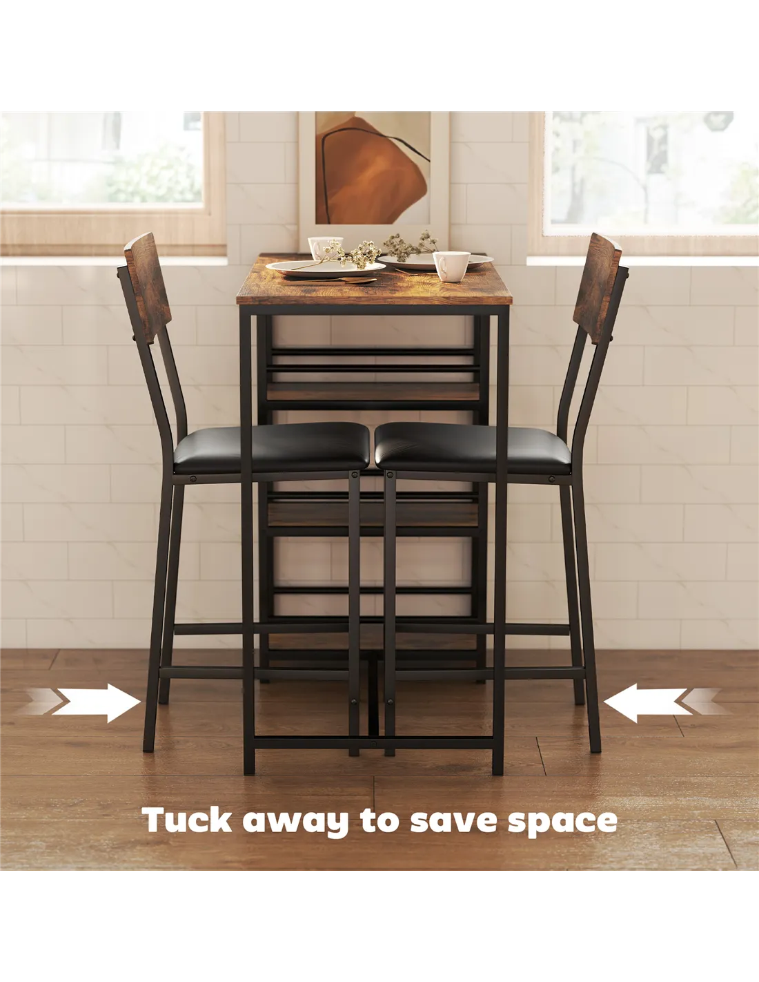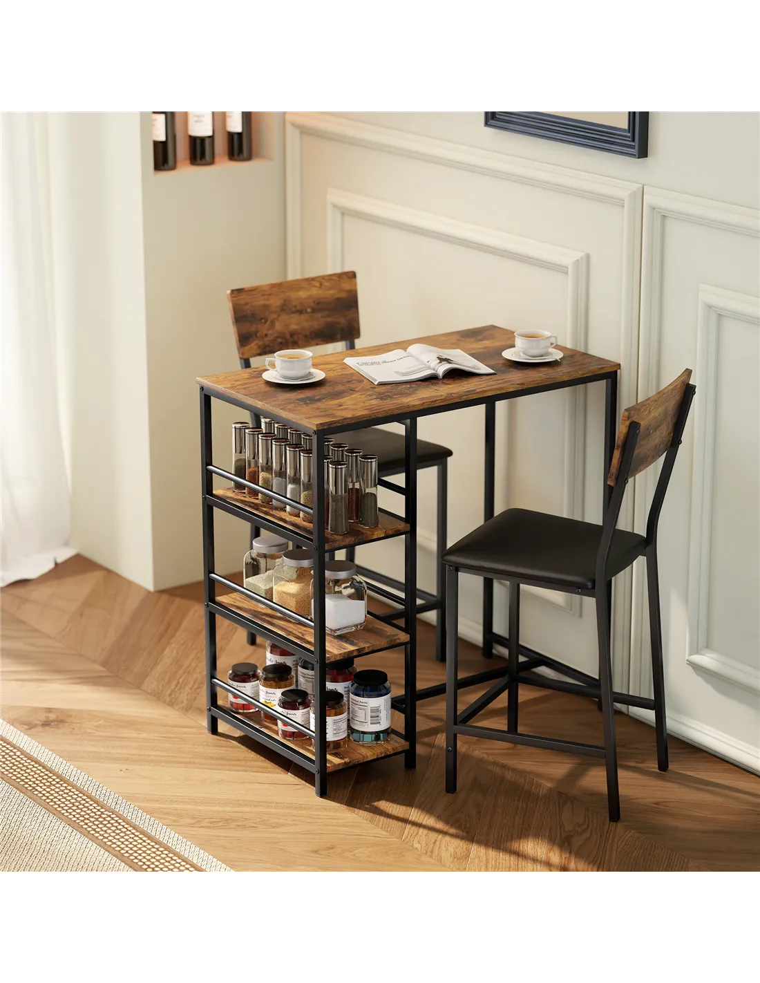 Elevate your dining space with the HOMCOM Three-Piece Compact Bar Table Set in Brown/Black. This functional set offers a smart solution for smaller homes or flats across the UK. It includes a stylish bar table and two matching bar chairs. The intelligent design allows chairs to tuck neatly underneath the table, maximising floor space when not in use. You gain convenient storage from the table's three integrated side shelves, perfect for keeping tableware or essentials close at hand. Enjoy enhanced comfort on the padded PU leather chairs, featuring supportive tall backs. Built with durable powder-coated steel frames and sturdy MDF, this set promises lasting quality. Its rustic brown and black finish complements modern interiors. This compact bar table set provides both practical dining and extra storage, making it ideal for everyday use.