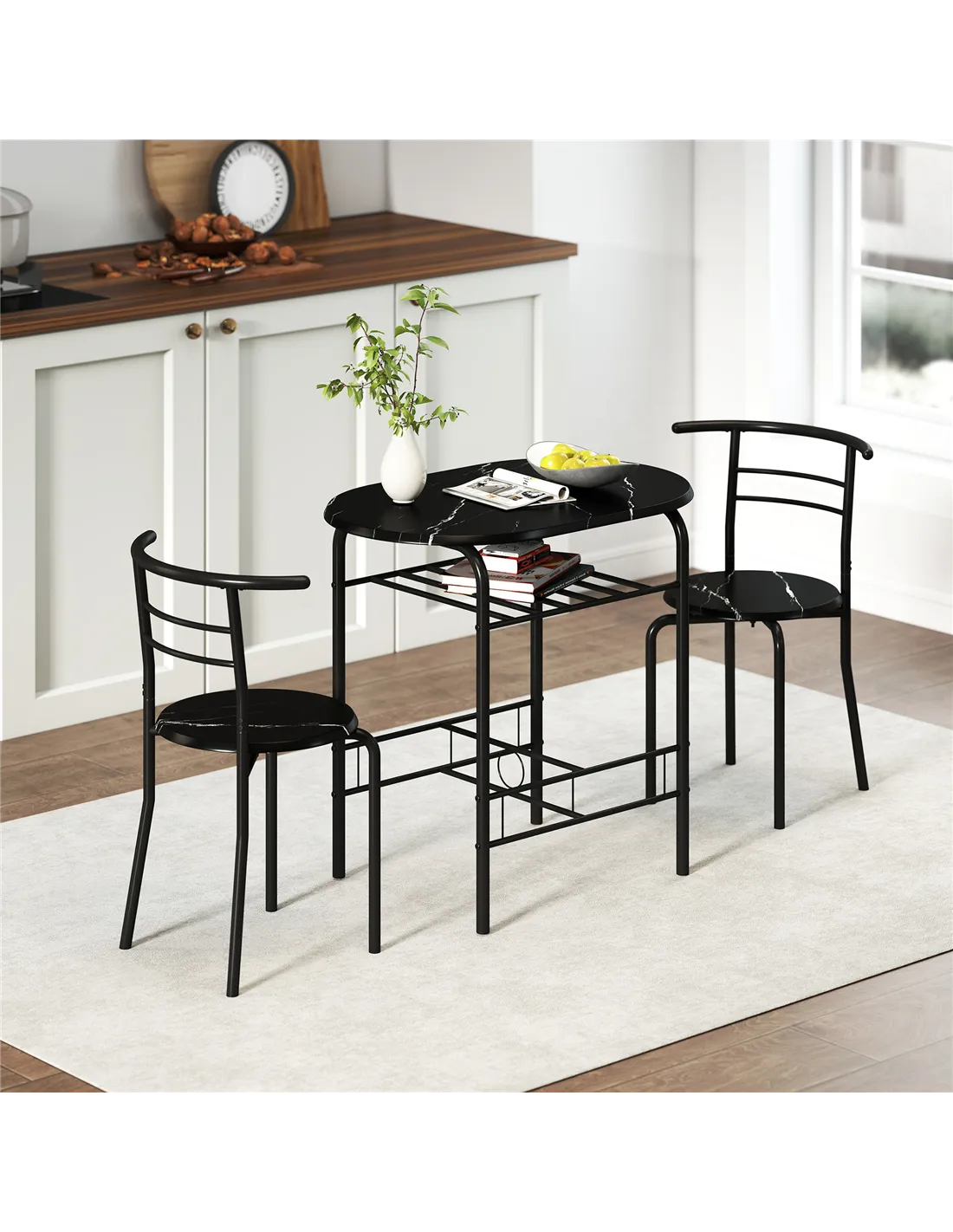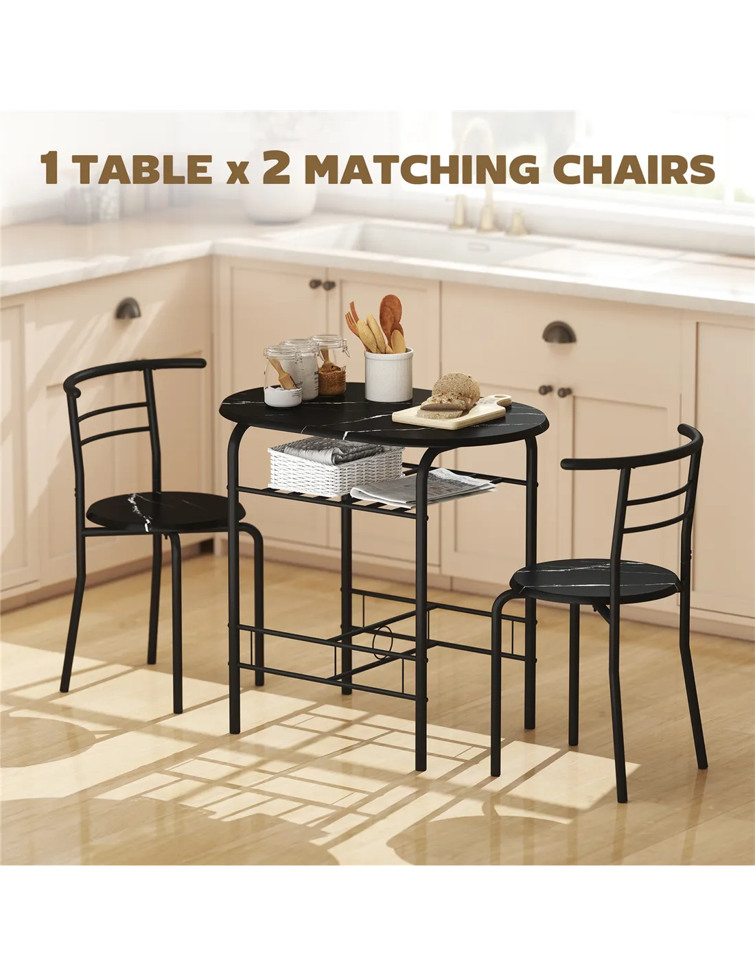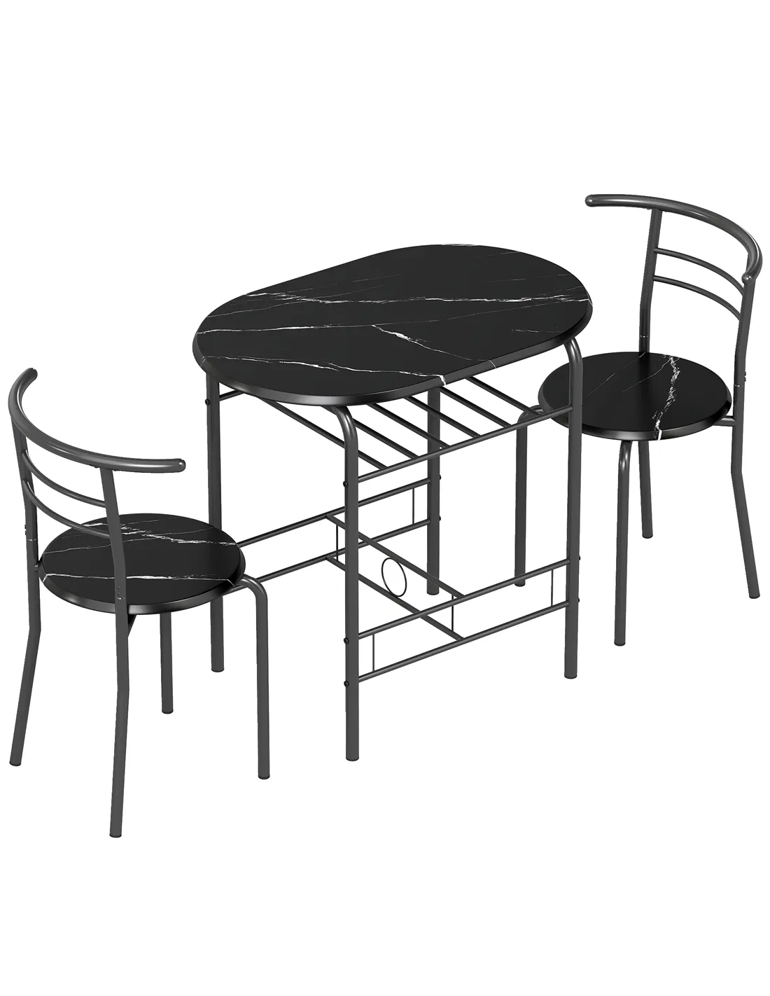 Optimise your space with the HOMCOM Three-Piece Compact Dining Set in Black. This essential set includes a dining table and two matching chairs, perfect for UK homes with limited room. Designed for two, it provides a dedicated dining area without occupying excessive space. The set features strong metal frames, ensuring durability and stability. Robust MDF tabletops present an elegant marble-effect design, enhancing any modern interior. A discreet shelf, positioned under the tabletop, offers convenient storage for light kitchenware or dining essentials. The chairs neatly tuck beneath the table, freeing up floor space when not required. This HOMCOM dining solution provides practical functionality and a contemporary aesthetic for compact living.