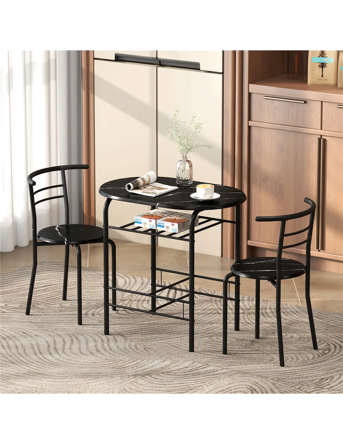 - Dining table set for two: a table and two matching chairs
