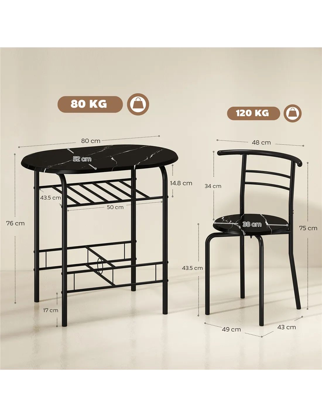 - A: The table measures 80L x 52W x 76H cm. Each chair measures 49L x 43W x 75H cm, with a seat size of Φ38 x 43.5H cm.