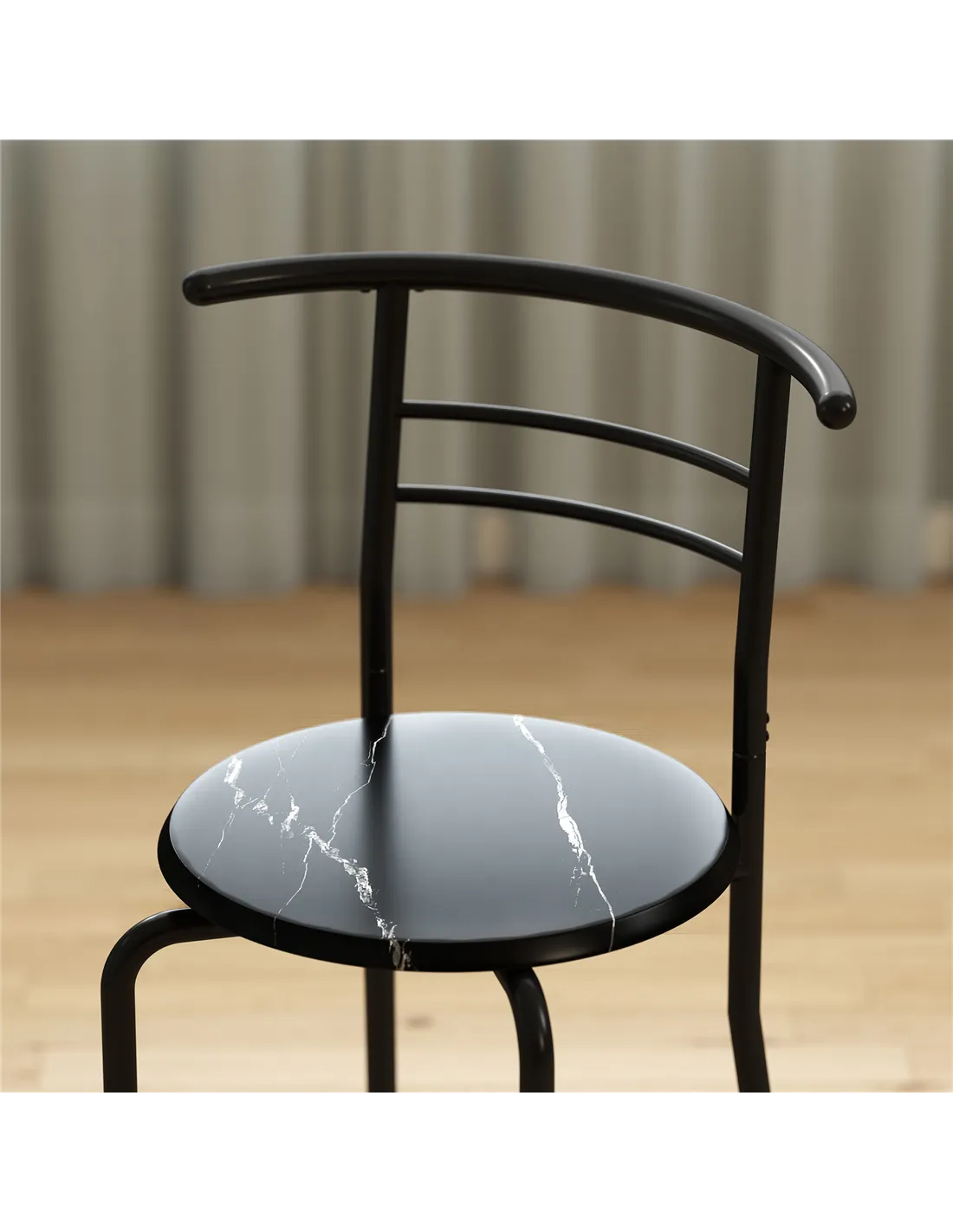 - A: The dining set uses strong metal for the frames and robust MDF for the tabletops. The tabletop features a marble-effect design.