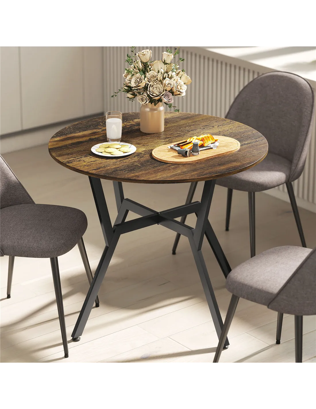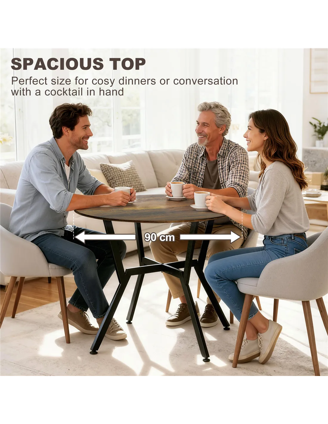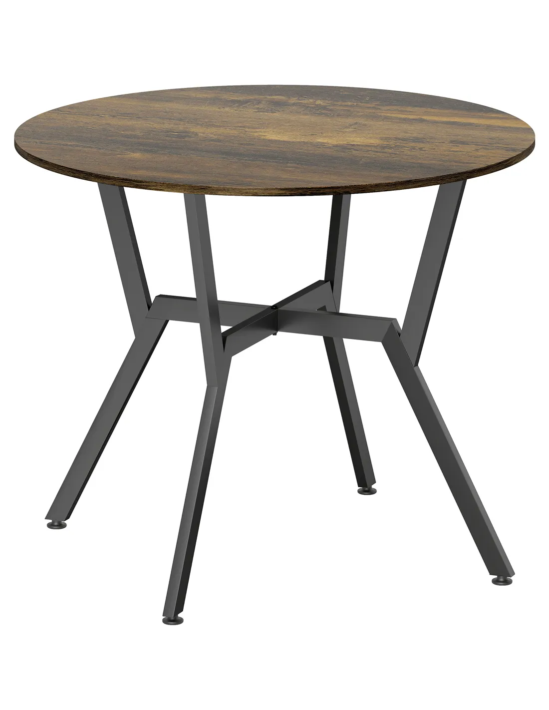 The HOMCOM Round Dining Table in Rustic Brown brings functional elegance to your UK home. This 90 x 76 cm kitchen table features a durable wood-effect particleboard top, complemented by sleek black steel legs. Its circular design comfortably accommodates two, creating an inviting space for dining or daily activities. The robust metal frame provides a strong, supportive base, enhanced by a middle cross bar for superior stability. Anti-slip foot pads prevent floor scratches, making this versatile piece ideal for your living room, dining room, or even a hallway. With a maximum load capacity of 60 kg, this table offers reliable performance. It combines classic aesthetics with modern durability, establishing a practical focal point. Assembly is straightforward, ensuring a quick setup for immediate use.