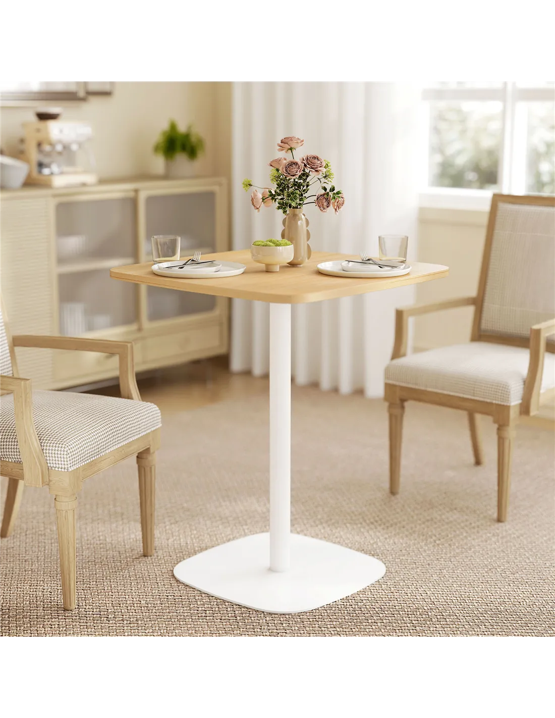 The HOMCOM Small Dining Table, a 60 cm square kitchen table, offers practical functionality for UK homes. This compact unit from FastDaddy combines a natural wood-veneer MDF top with a robust steel base, providing a dependable solution for smaller spaces. Designed to seat two comfortably, its 60 cm dimensions fit seamlessly into kitchens, dining areas, or serve as a dedicated home office workspace. The smooth, painted surface allows for effortless cleaning, promoting hygiene. A sturdy 41.5 cm square steel pedestal base ensures strong, reliable support. Soft anti-slip felt pads keep the table firmly in place, preventing any wobbles. Featuring a natural wood and white finish, this table delivers a modern, simple aesthetic. Assembly is straightforward, making this versatile table an ideal choice for daily use.
