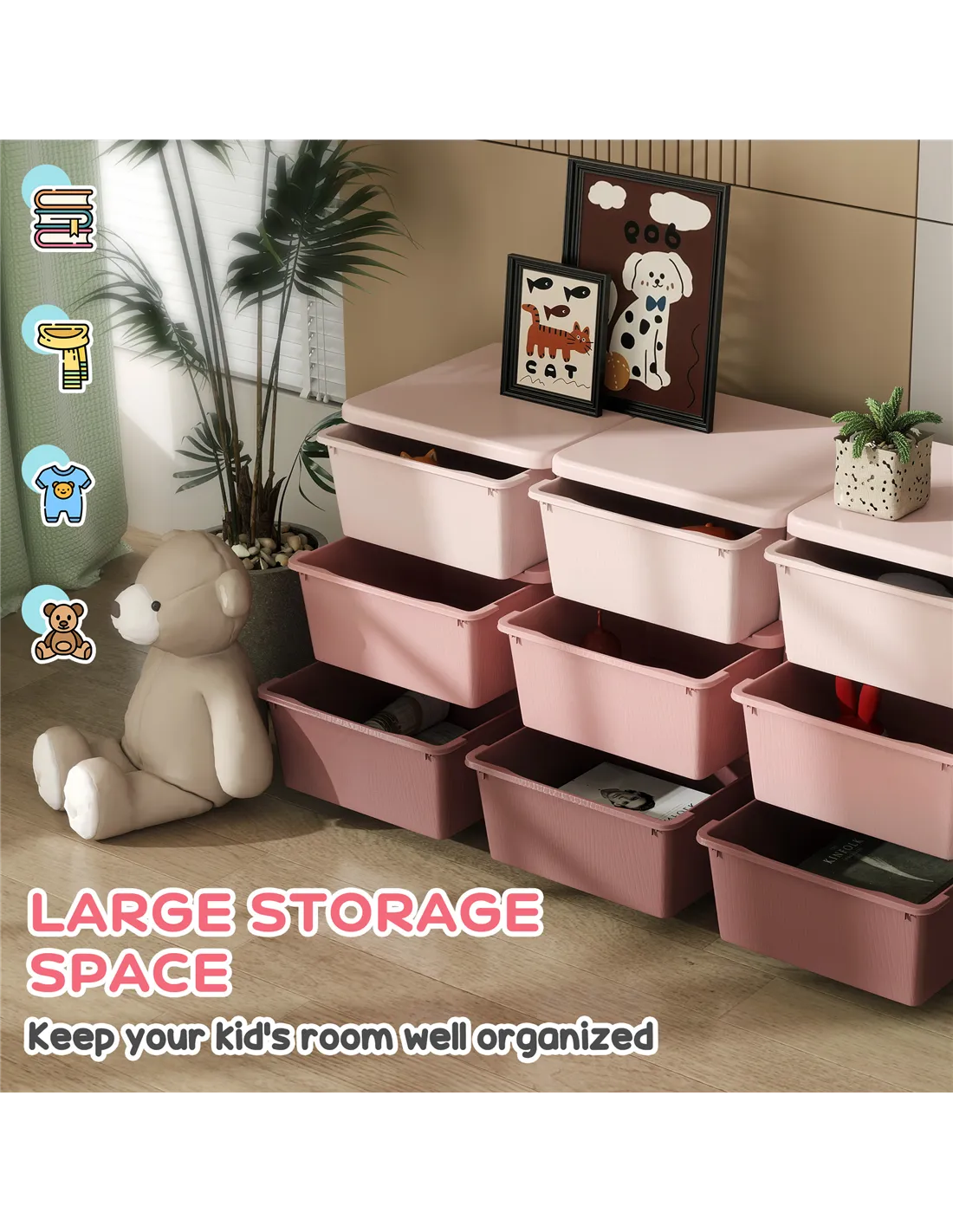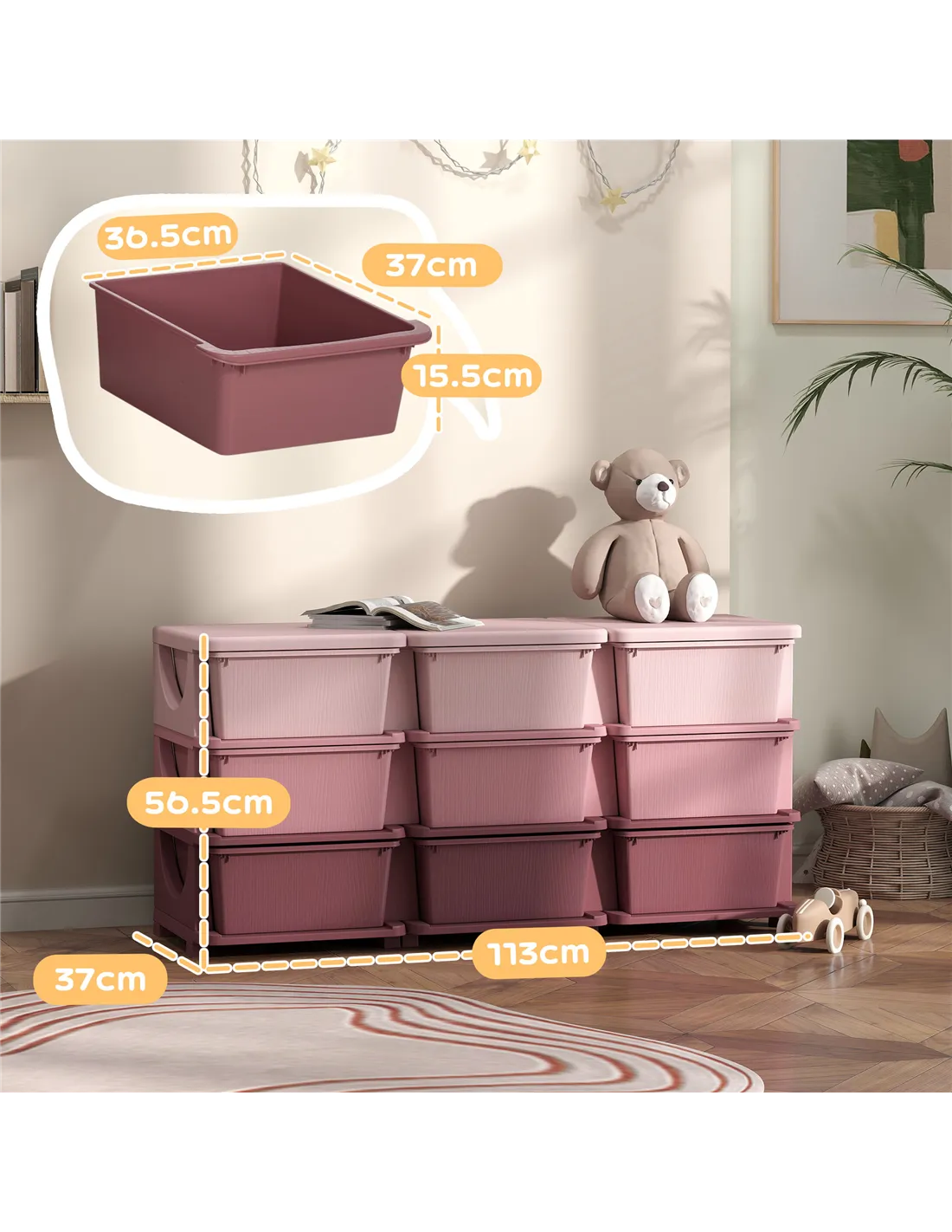 Organise your child's space with the HOMCOM Kids Storage Unit, available at FastDaddy. This pink storage solution features nine removable drawers, providing extensive space for toys, books, and crafts. Constructed from robust PP material, the unit offers durability for everyday family life. Its smooth, wipe-clean surface makes maintenance easy, addressing spills and marks efficiently. Safety features include rounded corners, preventing accidents in play areas. Measuring 56.5cm high, 113cm long, and 37cm wide, it suits children aged 3-6 years. Each drawer supports up to 10kg, contributing to a substantial 60kg total capacity. A stable base and stump feet provide secure placement. This unit requires assembly to set up your child's tidy room.