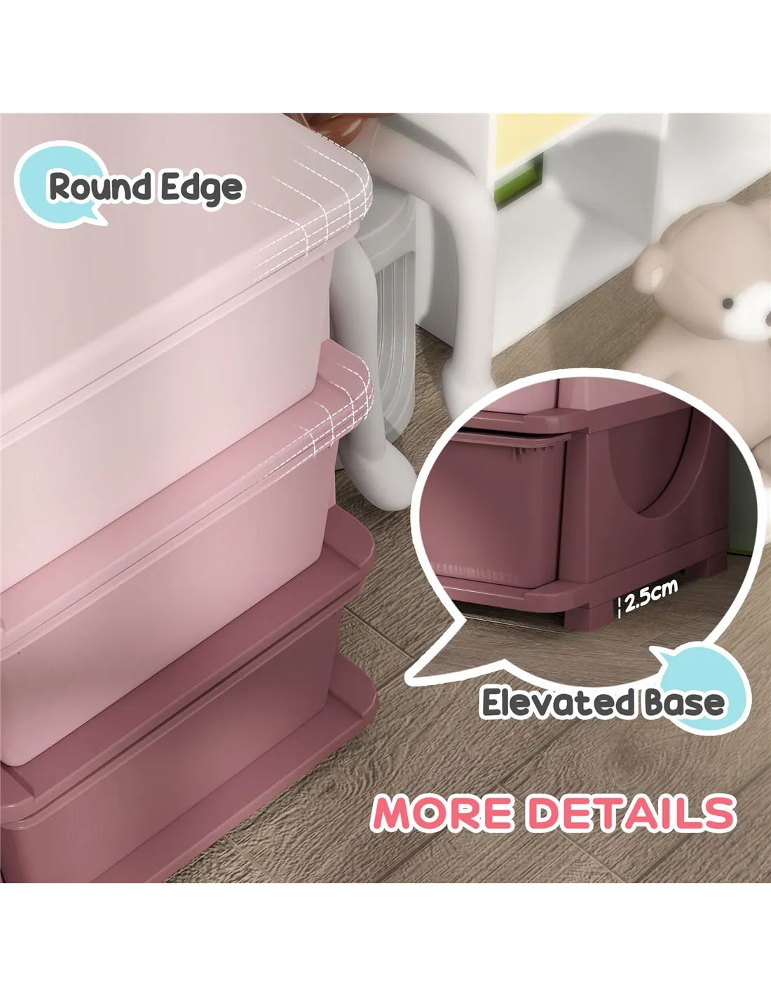 - Stump feet keep the storage boxes balanced