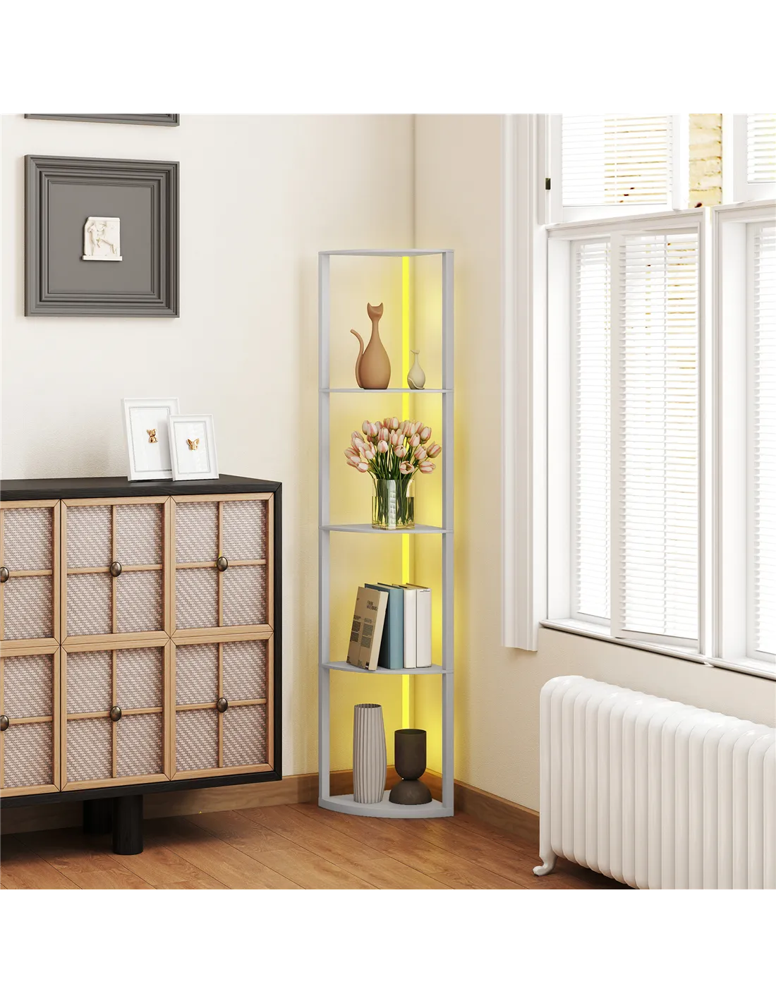 Enhance your interior with the HOMCOM RGB LED Floor Lamp with Shelves. This 5-tier standing lamp integrates adaptable lighting with practical vertical storage for your UK home or office. It features vibrant RGB LED lights, offering a full spectrum of colours to create a specific mood. Adjust brightness levels precisely, from subtle ambient light to clear illumination, using the included remote control. The lamp's tall, narrow grey design fits neatly into corner spots, maximising floor area in your living room, bedroom, or office. Five sturdy shelves provide organised display space for books, decor, or small items. Each tier supports up to 2.3 kg, ensuring stable and reliable storage. This modern corner display unit offers a functional light source and an efficient space-saving solution, designed to complement contemporary UK living.