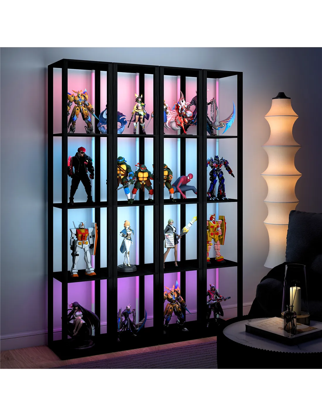- Four-tier shelves provide lots of storage and display space