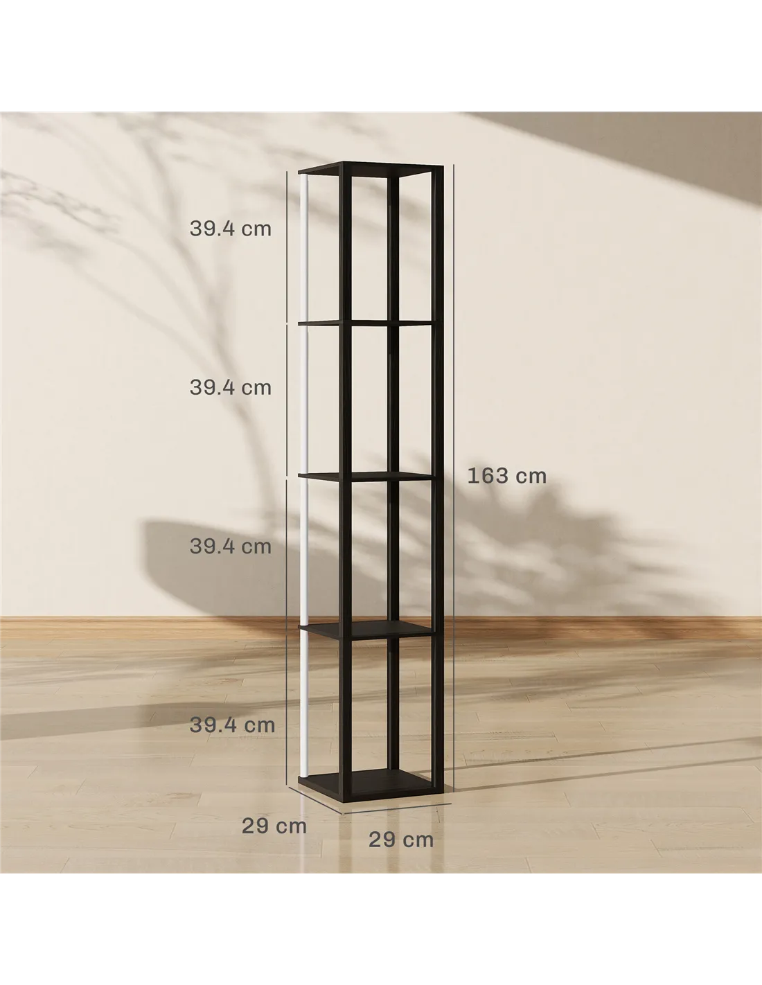- A: The overall dimensions are 29L x 29W x 163H cm. Each shelf measures 29L x 29W x 39.4H cm.