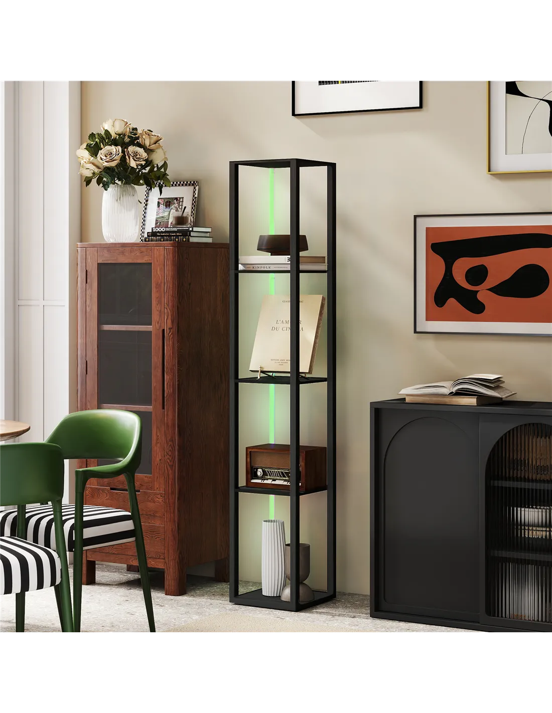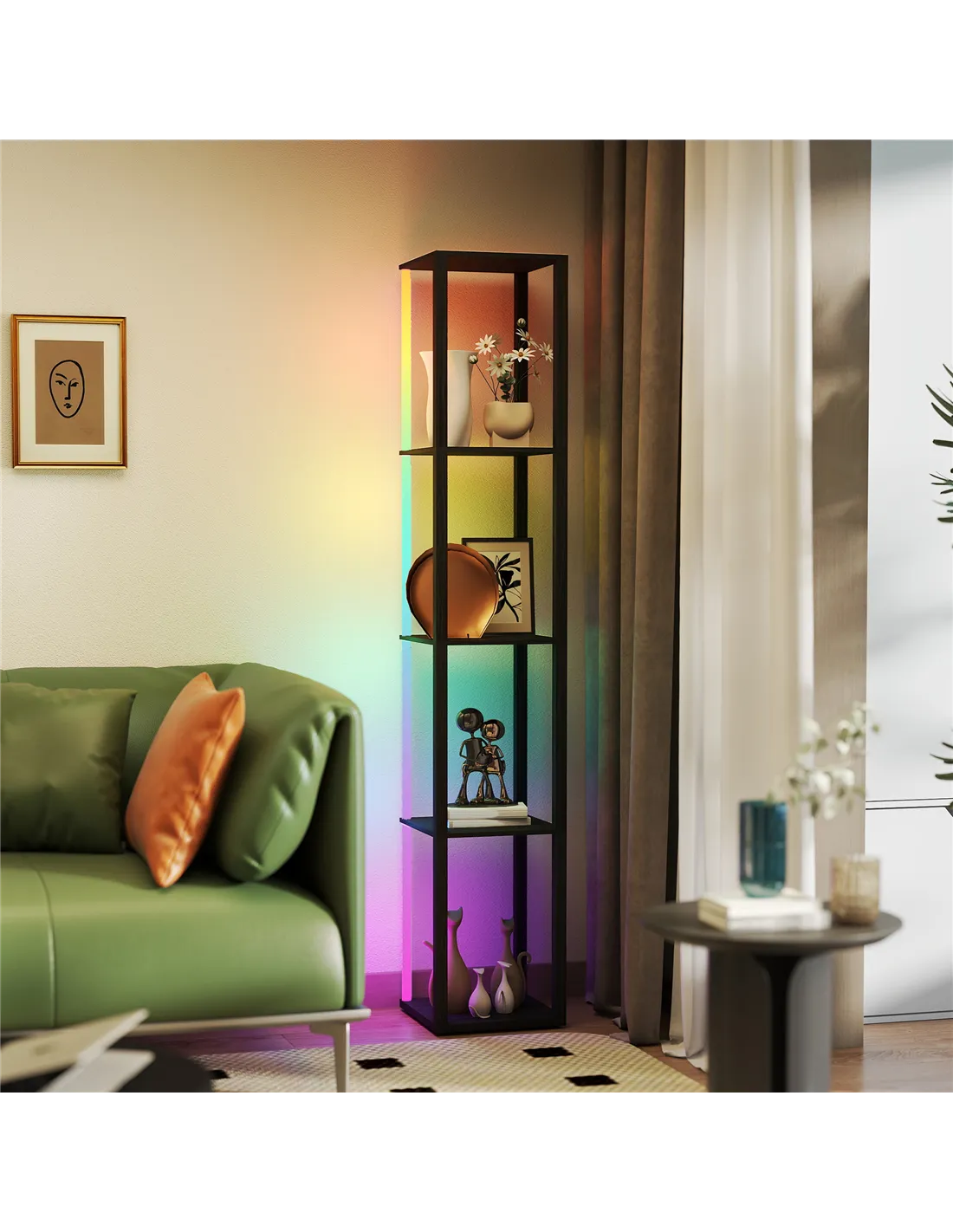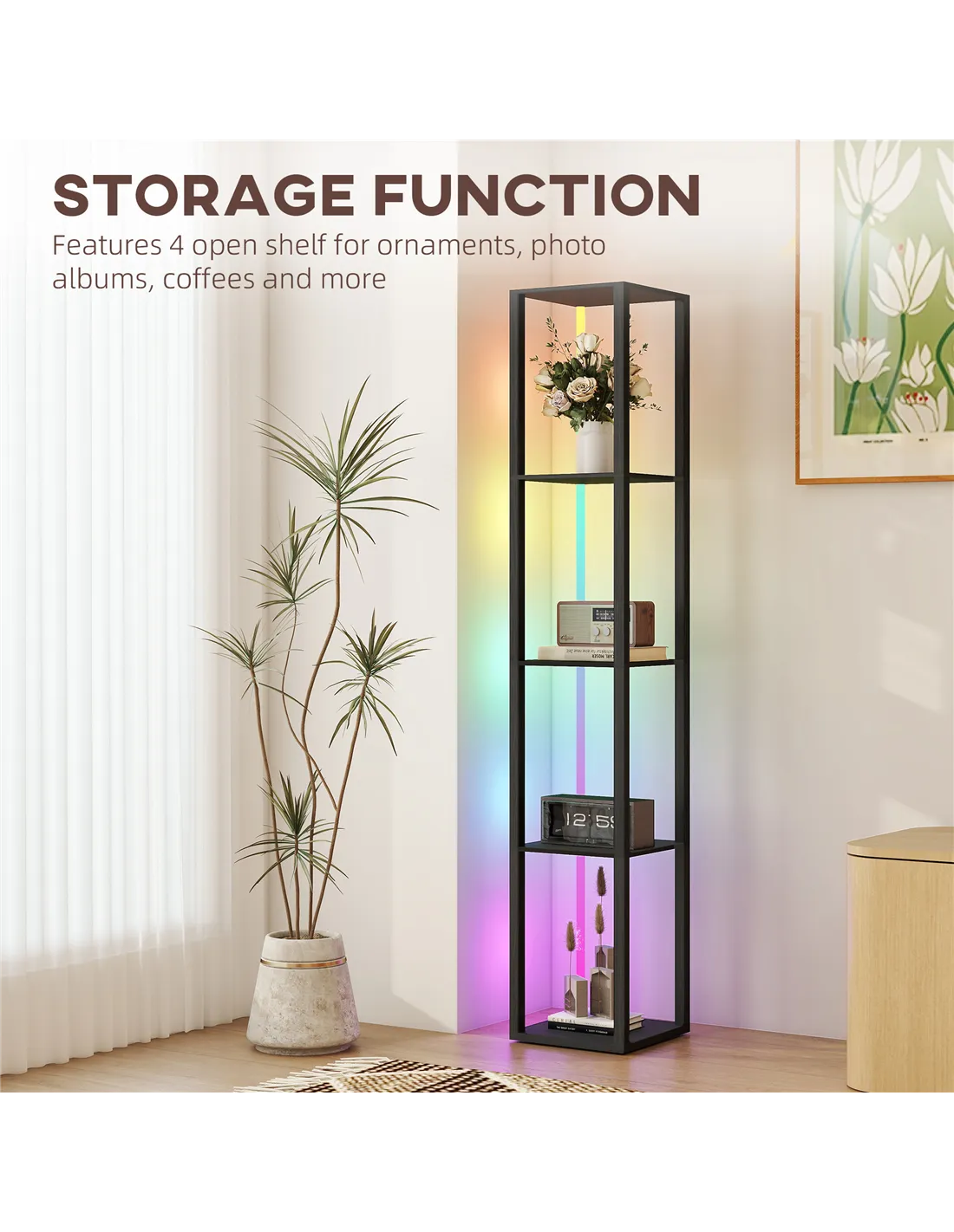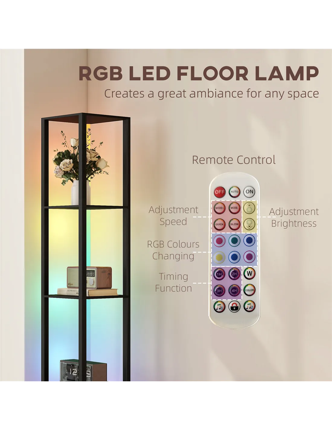 Elevate your home environment with the HOMCOM RGB LED Floor Lamp. This modern black standing lamp delivers versatile illumination and integrated storage. Control brightness and speed directly with the included remote. Position it in your living room, bedroom, or office for enhanced functionality. Four-tier shelves provide practical display space for books, decor, or other items. The RGB LED lighting system creates diverse ambient moods to match any preference. Constructed from stable MDF and PVC veneer, this lamp offers a durable, space-saving solution for UK homes. You receive ambient light and essential storage from one cohesive unit. Dimmable functions allow you complete control over your lighting atmosphere, adapting to your specific needs.