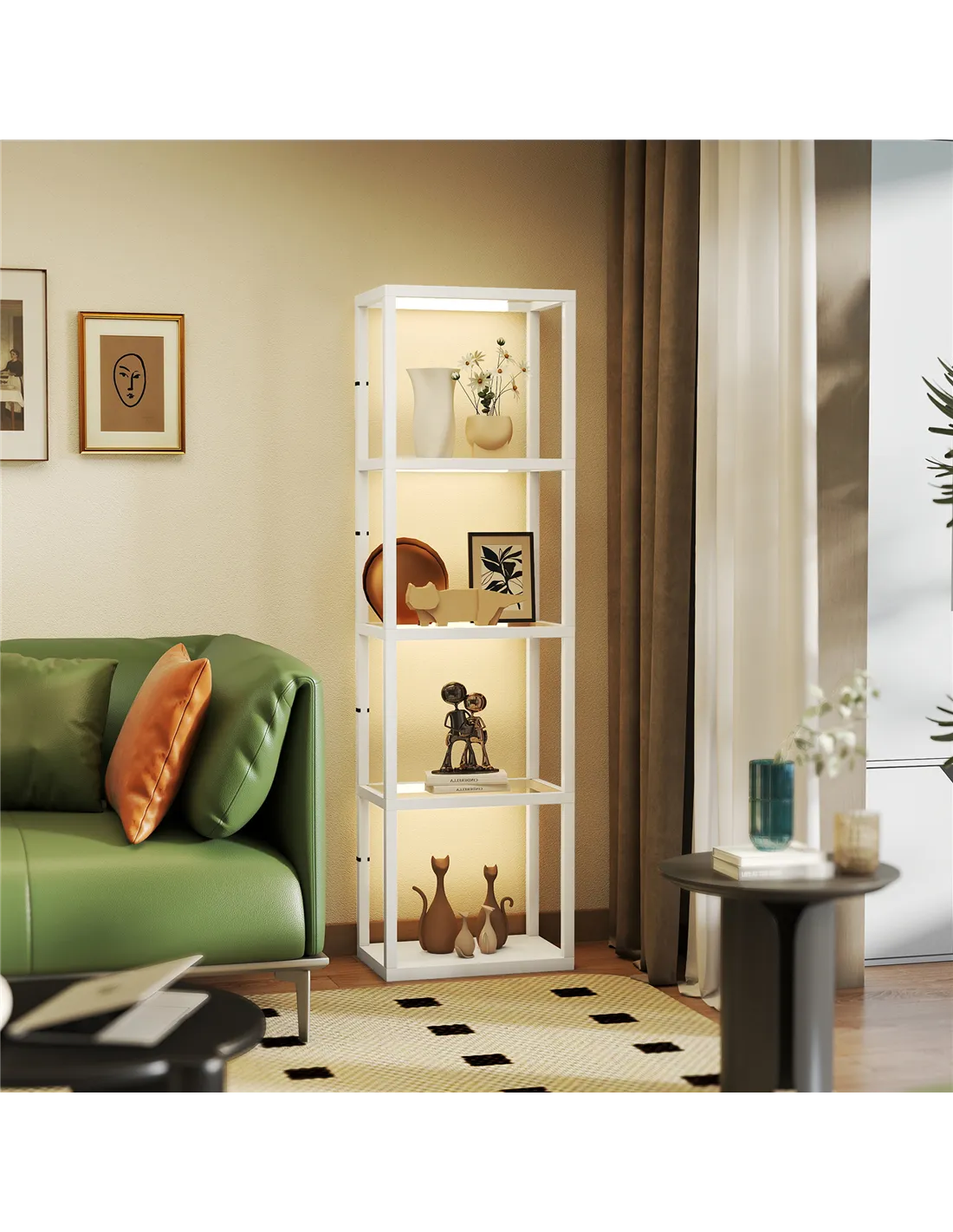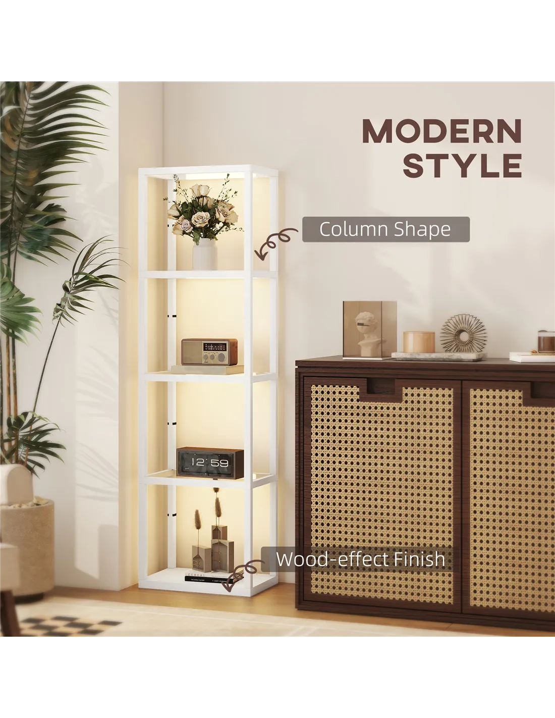 - Four shelves offer space for holding favourite decorations, books and more
