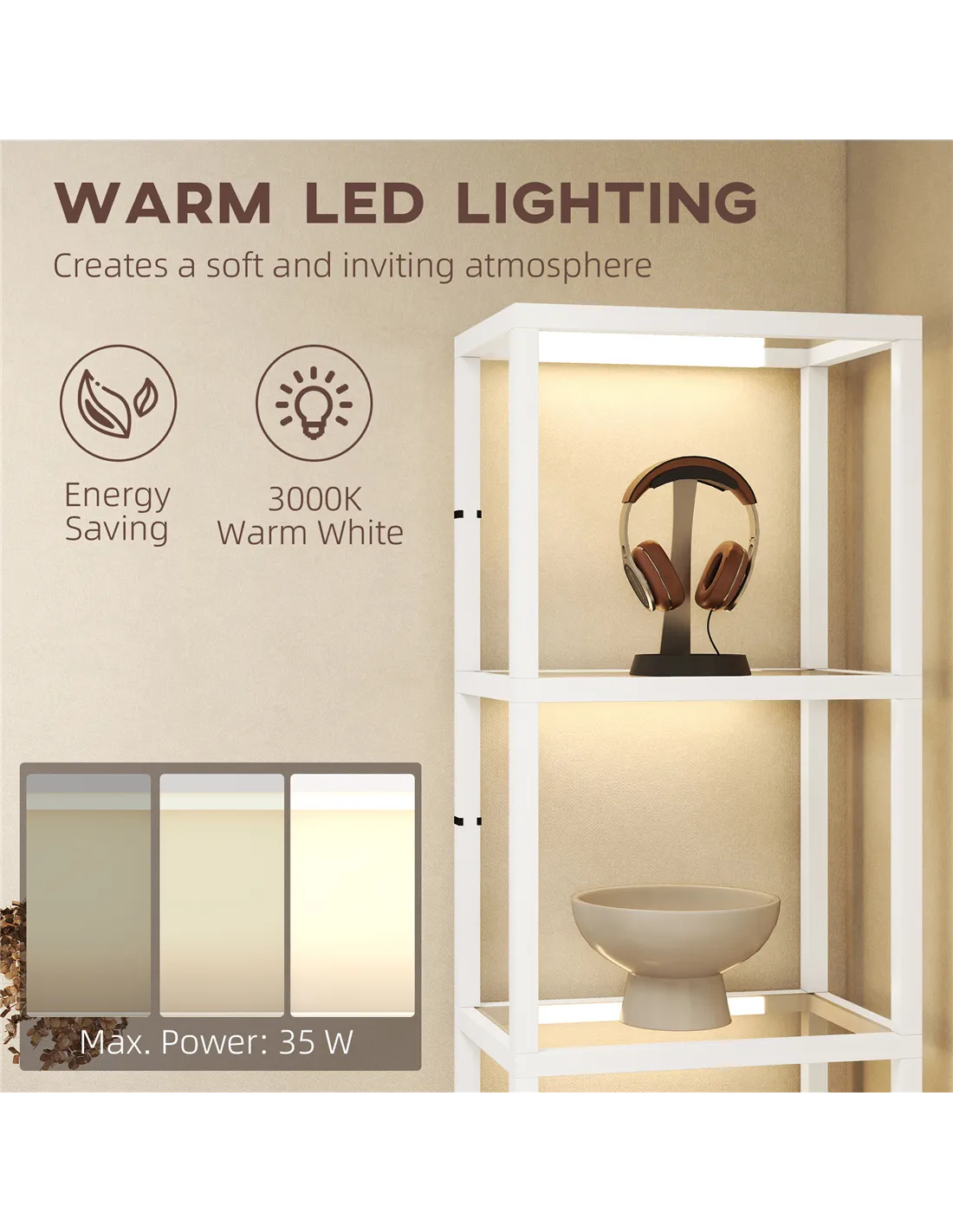 Enhance your living space with the HOMCOM Four-Shelf Floor Lamp in White, available at FastDaddy. This versatile floor lamp combines functional illumination with practical storage, designed for UK homes. It features four integrated 3000 K warm white LEDs, offering three distinct brightness levels. Adjust the light to create your desired atmosphere using the convenient foot switch. Four durable shelves provide ample space for displaying decor, books, or personal items. The sleek tempered glass shelves allow light to permeate from top to bottom, ensuring consistent illumination. Constructed from tough MDF with a beautiful wood-effect finish, this lamp offers both style and stability. Its compact design fits various room layouts. Assembly is straightforward. This lamp supports a total weight of 9 kg, with each glass shelf holding 2 kg and the bottom shelf 3 kg. Elevate your home decor and organisation with this practical lighting solution.