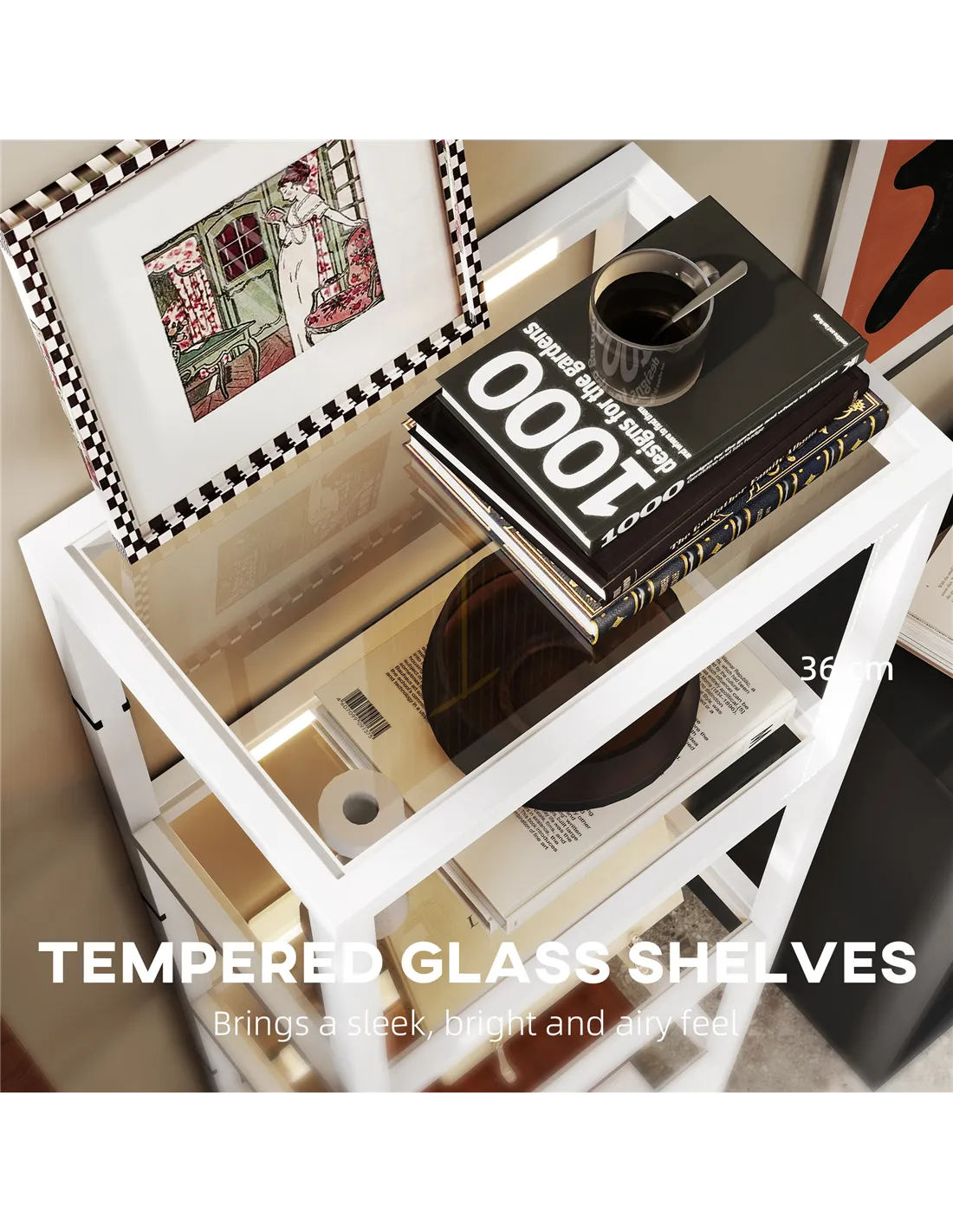 - Tempered glass shelves allow the light to pass through, for light from top to bottom