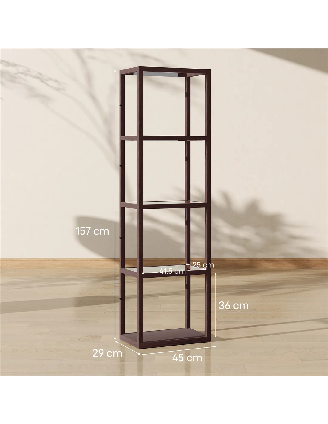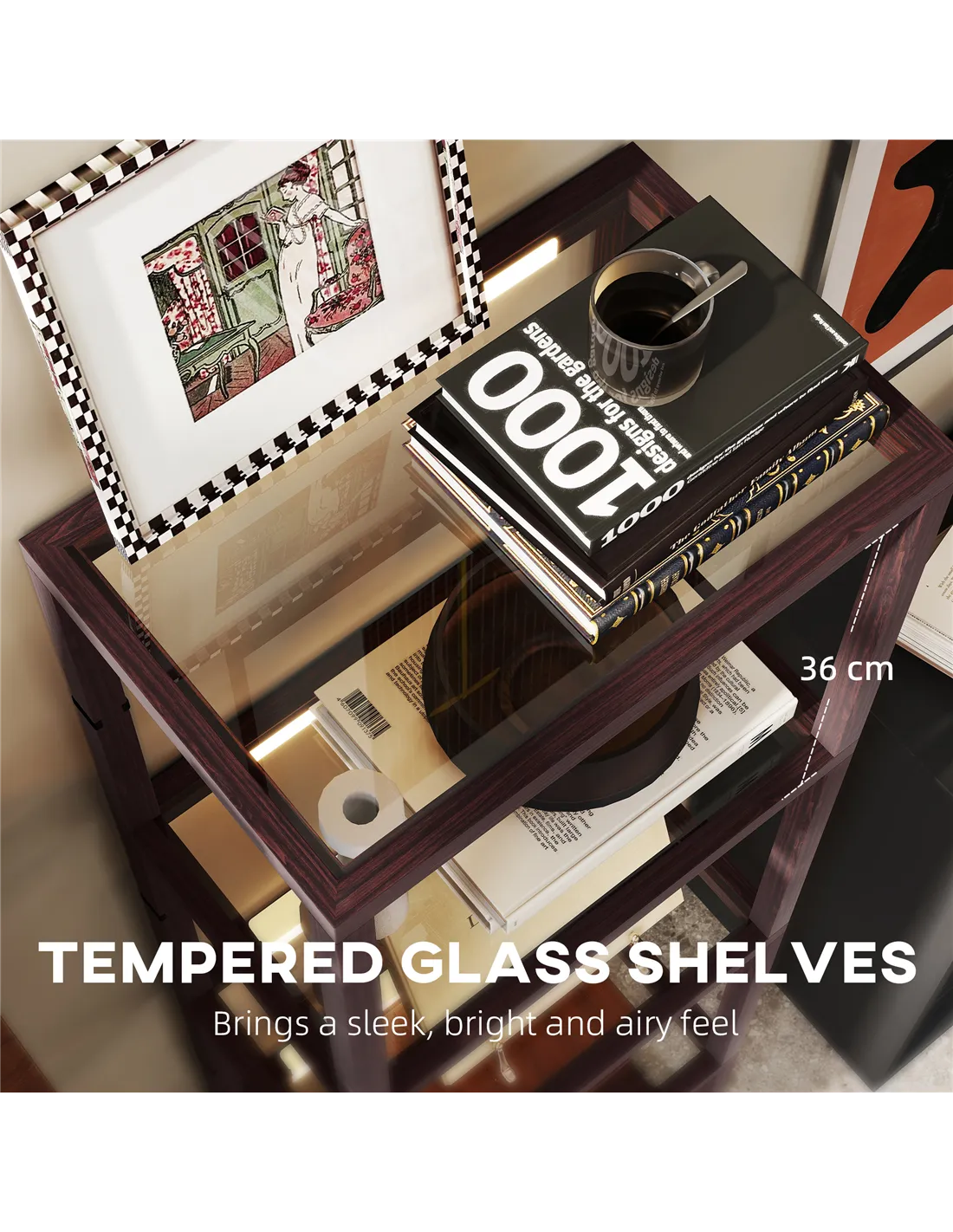 The HOMCOM Four-Shelf Floor Lamp in Dark Brown provides a dual-purpose solution for your living space. This elegant lamp combines warm ambient lighting with essential display and storage, perfectly suited for UK homes. It features four integrated 3000 K warm white LEDs, offering three distinct brightness levels. Adjusting the illumination is simple via a convenient foot switch, eliminating the need to bend. Four sleek tempered glass shelves offer ample space for your favourite decorations, books, or cherished items. The transparent design ensures light permeates evenly from top to bottom. Crafted from durable MDF with a sophisticated dark brown wood-effect finish, this lamp measures 157H x 45L x 29W cm. It supports a total weight capacity of 9 kg, with each glass shelf handling 2 kg and the bottom shelf 3 kg. Installation proves easy for users.Features: