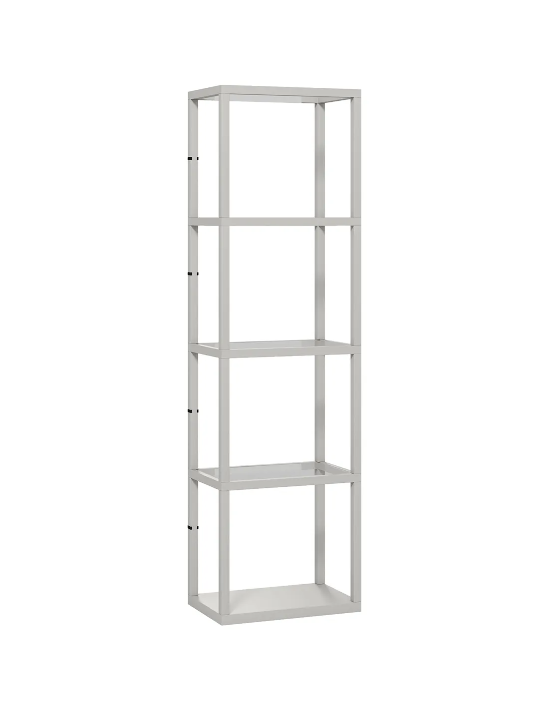 - A: The overall dimensions are 45L x 29W x 157H cm. It is constructed from tough MDF with a grey wood-effect finish and features tempered glass shelves.