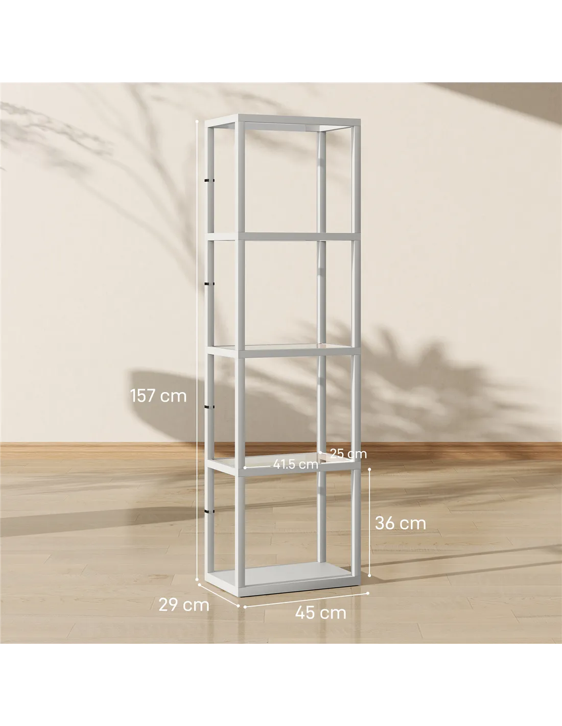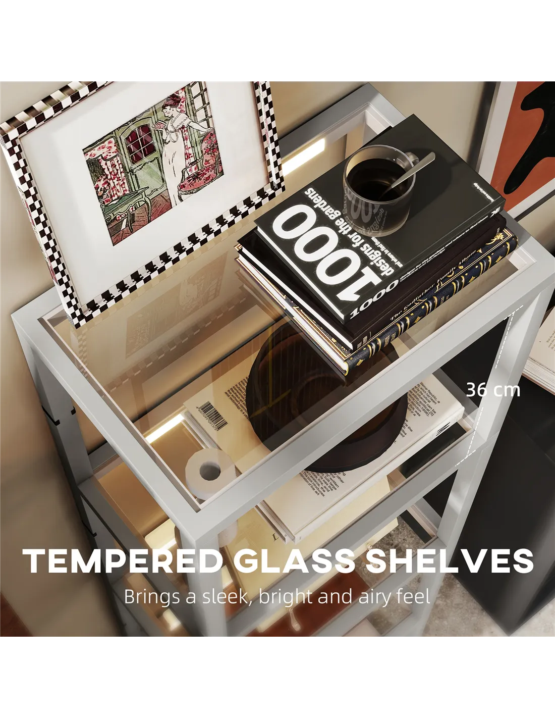 - A: The four tempered glass shelves provide space for decorations, books, and other favourite pieces. Each glass shelf supports 2 kg, while the bottom shelf holds 3 kg, with a total capacity of 9 kg.