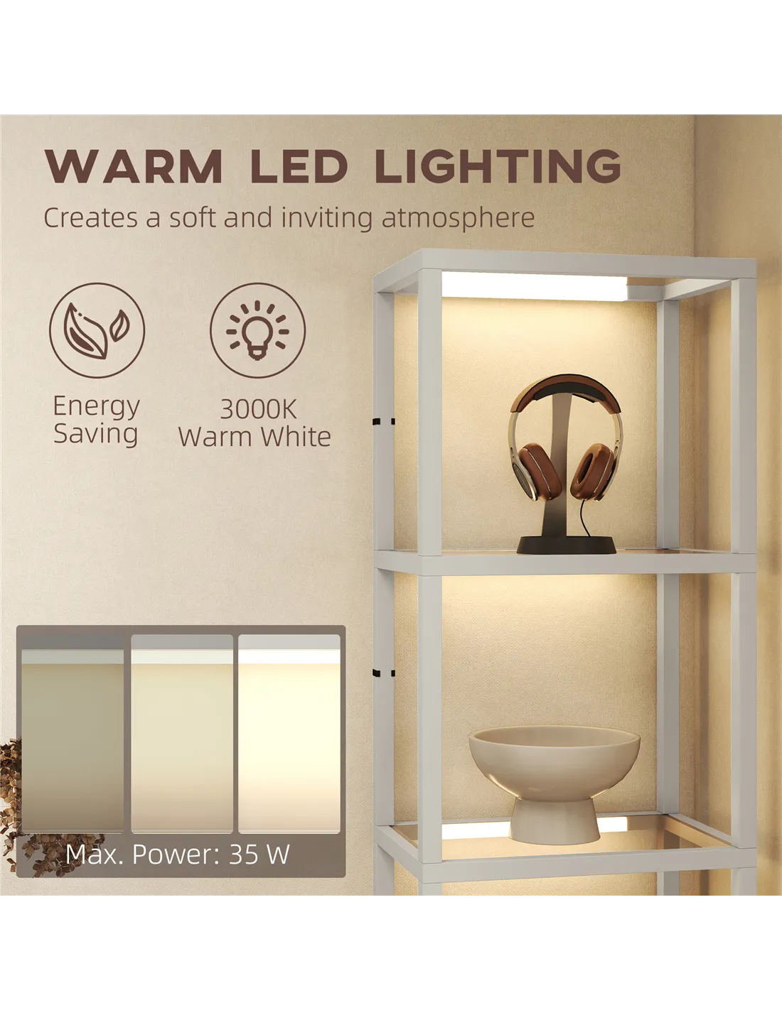 The HOMCOM Four-Shelf Floor Lamp in Grey integrates practical illumination with clever storage, making it a valuable addition to your home. Designed for UK residents, this floor lamp combines ambient lighting with functional display space. Four warm white LED lights offer three distinct brightness levels, allowing you to tailor the atmosphere to your preference. Its robust MDF frame features an attractive wood-effect finish in grey, complementing various interior decors. Four tempered glass shelves provide ideal surfaces for showcasing cherished decorations, books, or daily essentials. These transparent shelves ensure light disperses effectively from the top to the bottom of the lamp. Adjusting the brightness is simple, with a convenient foot switch located at the base. This lamp delivers efficient lighting and smart storage, optimising space in your living area or bedroom.Features: